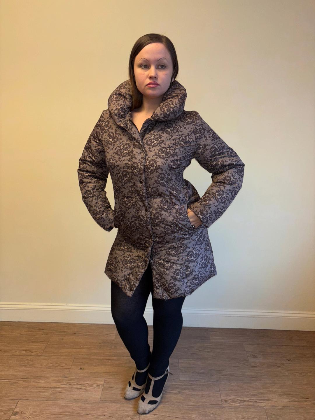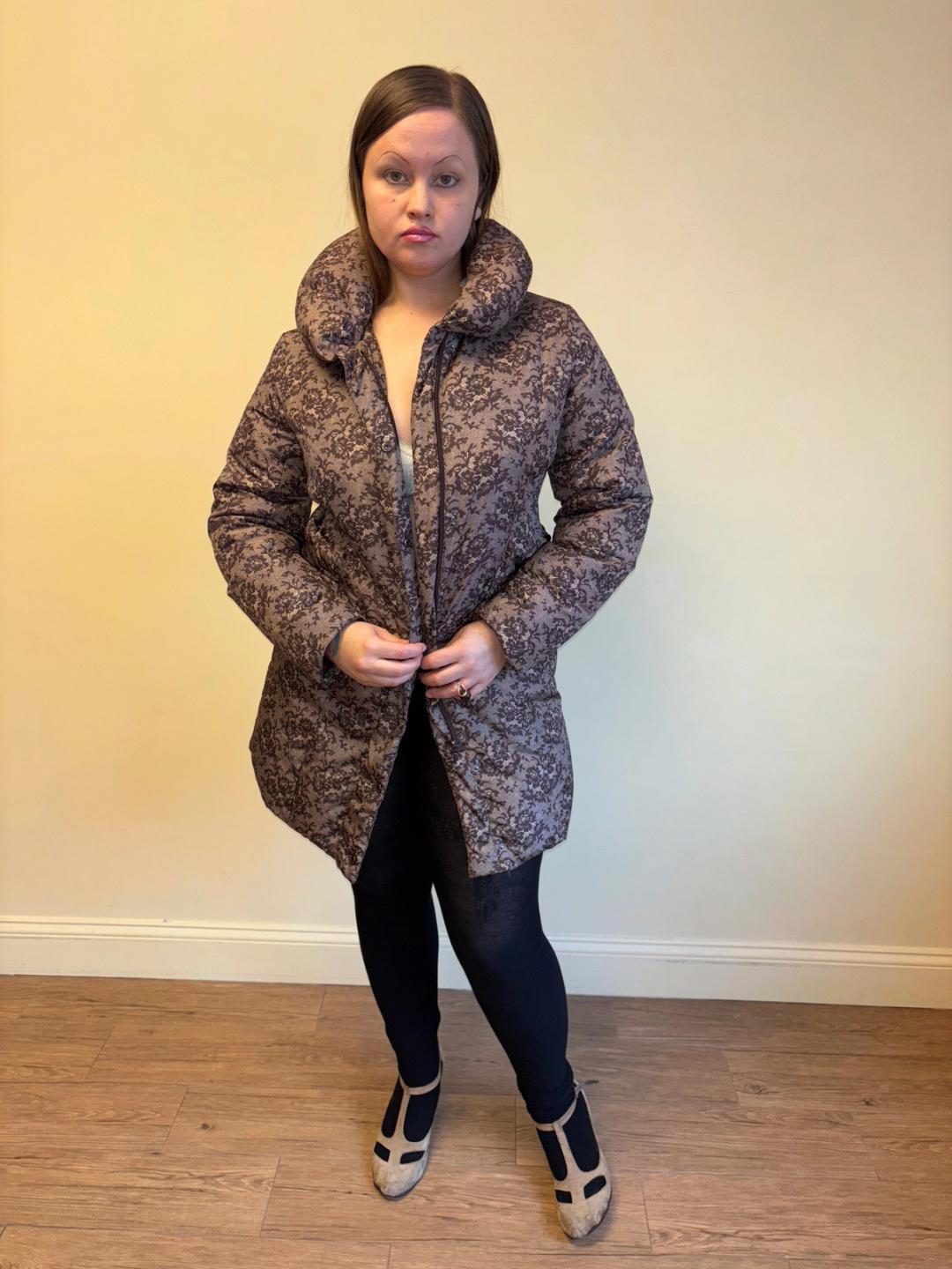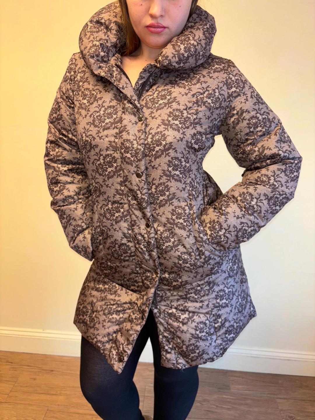 Masaki Matsushima lace print puffer jacket with oversized collar. The jacket is down-filled has a zipper and snap closures on the front. Excellent condition.