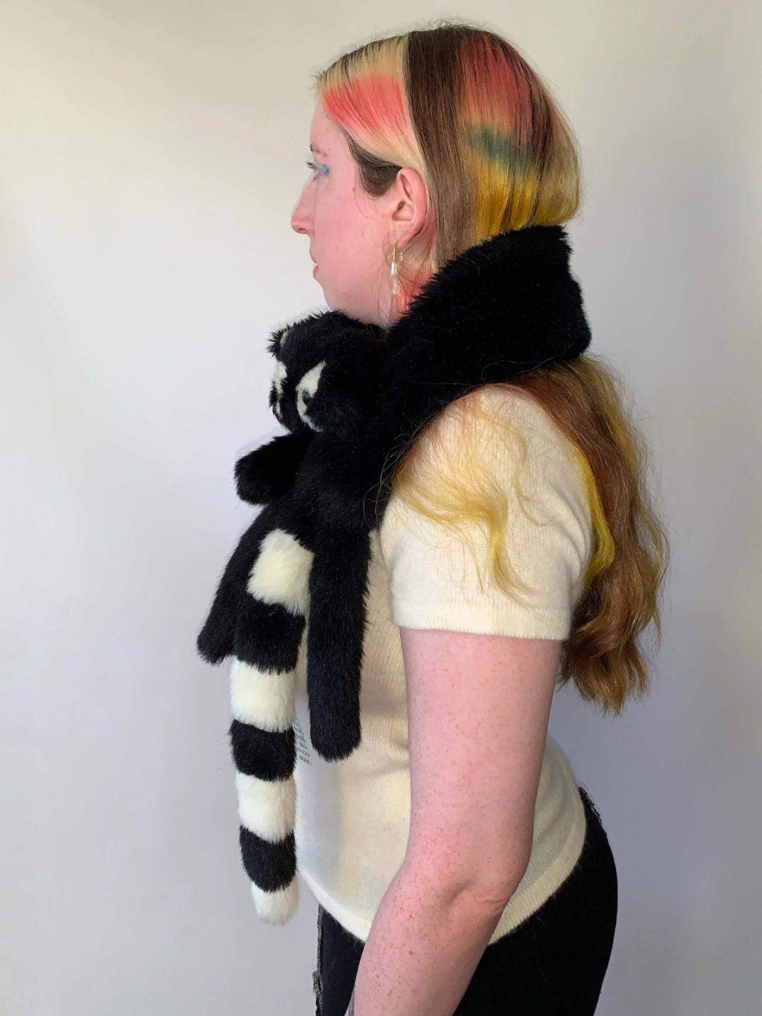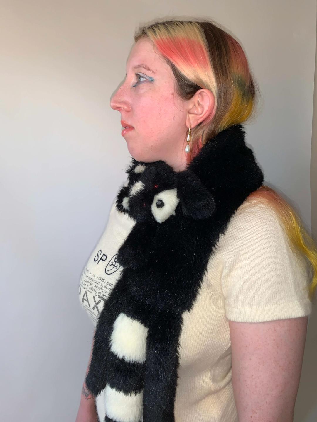 Faux fur scarf by MILK. The animal seems to be a red panda, skunk, raccoon hybrid? The creature has bright red star gem eyes! It has a clasp to attach the sides together around the neck. One size fits most!