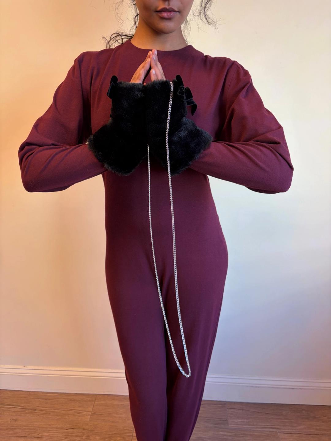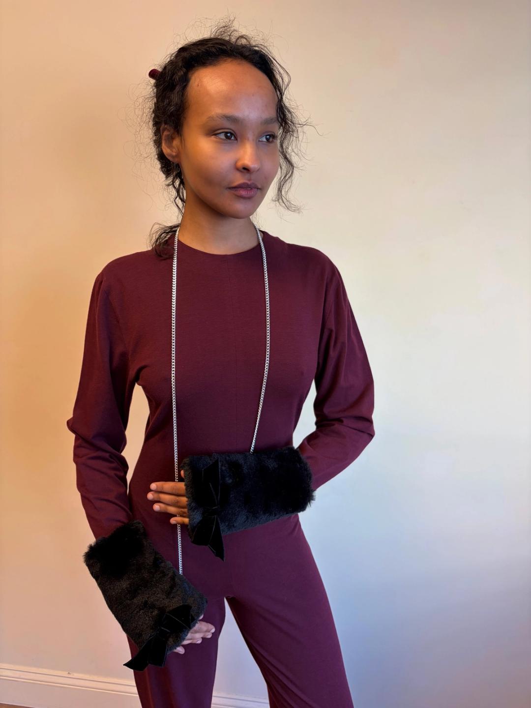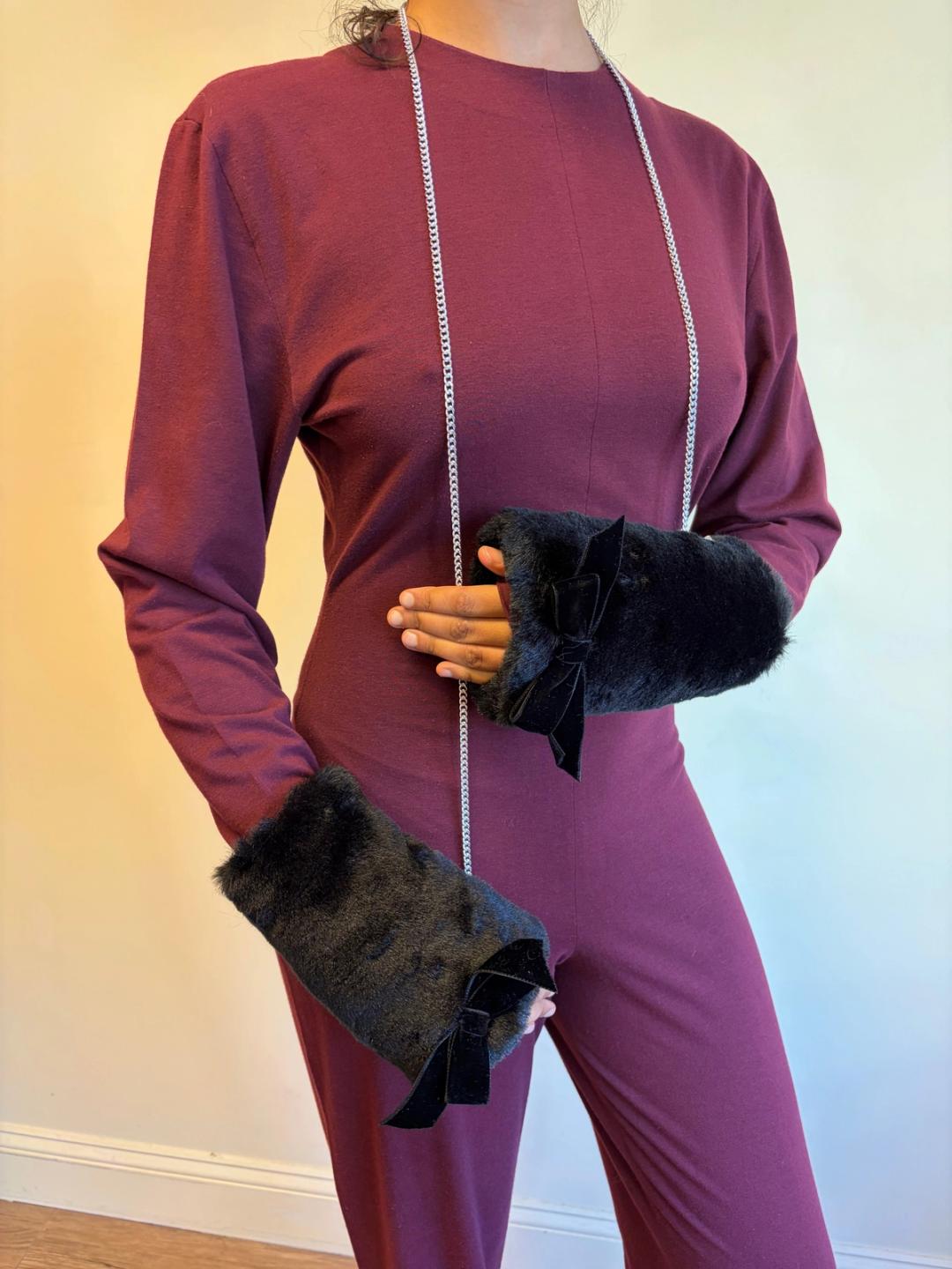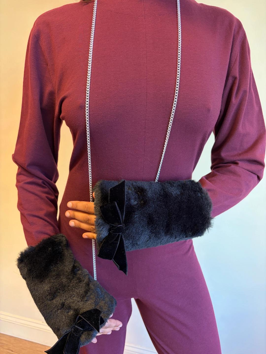 MILK faux fur black arm warmers with bows. The arm warmers have a detachable chain that connects them.