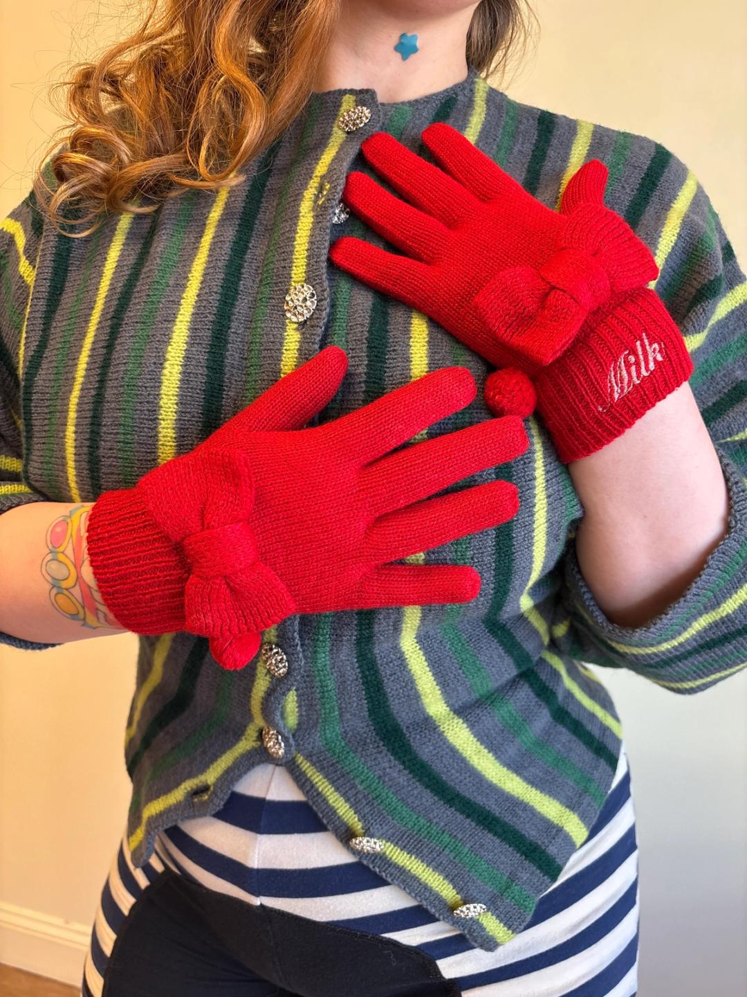 Red knit gloves by MILK. The gloves have oversized bows and embroidered text. One size fits most.