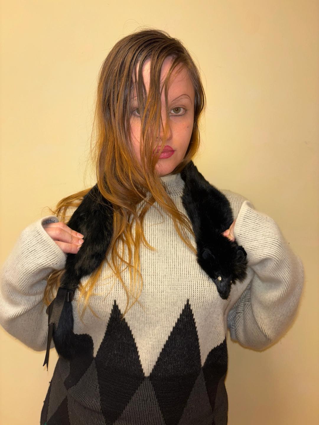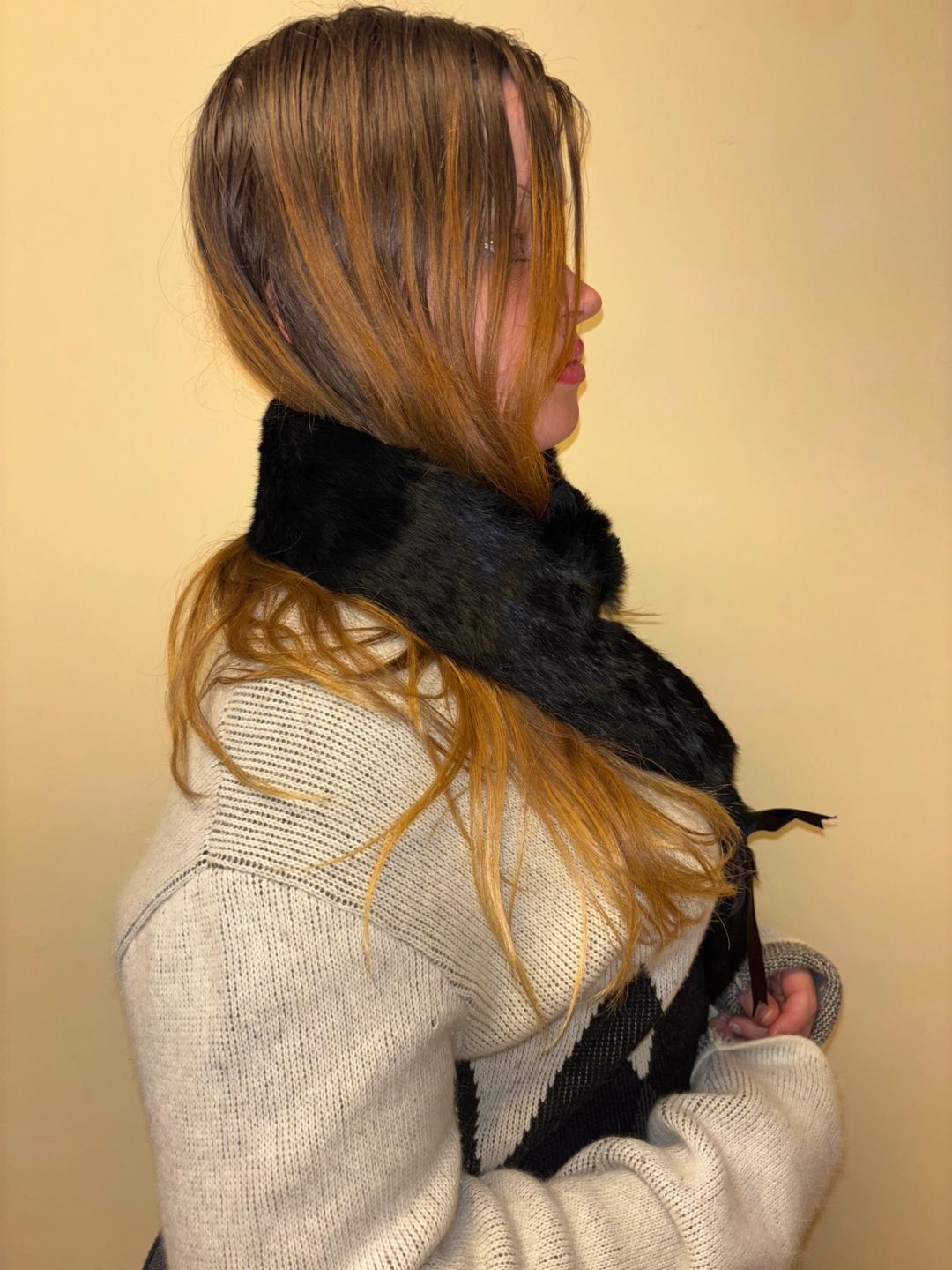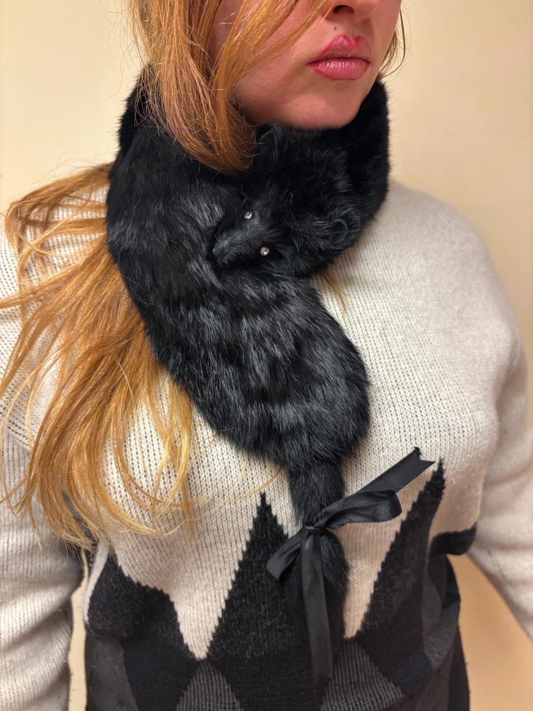 "Fox" style stole made of rabbit fur. The stole has rhinestone eyes and a bow tied around its tail. There's a clip closure in the mouth to fasten it around the neck.