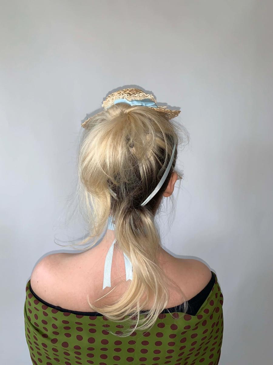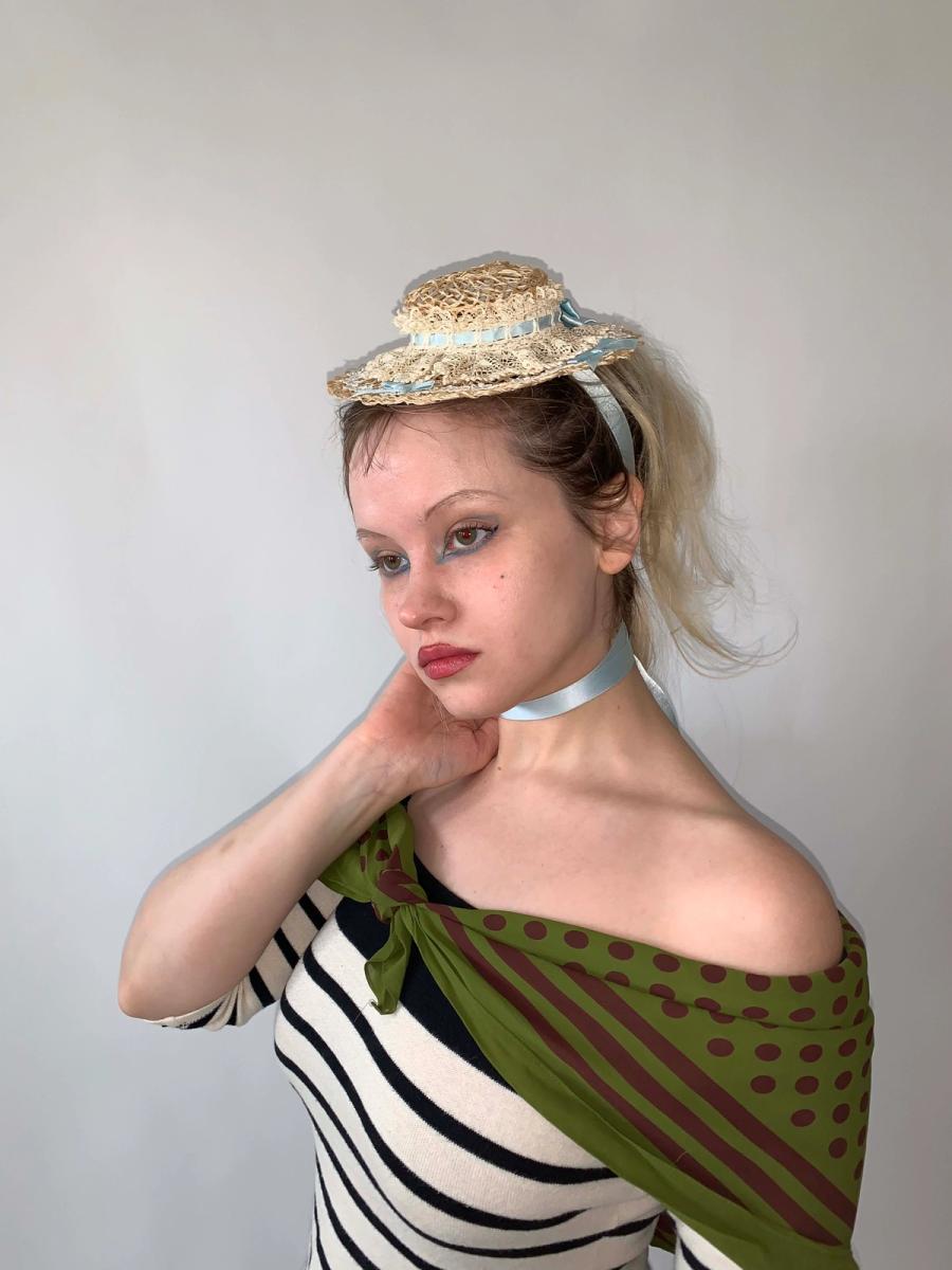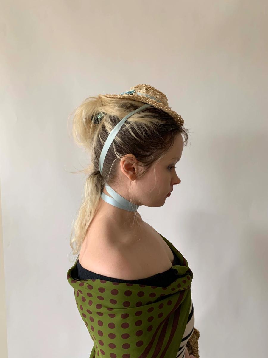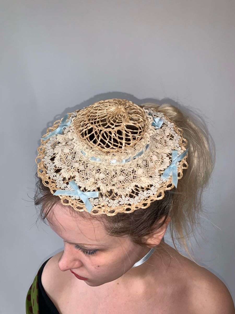Lovely mini straw boater with baby blue ribbon tie. The hat is a reproduction of 1890s hat styles. The hat is made of delicate straw, lace, and ribbon but is sturdy and wearable. Enjoy an antique hat style without the worry of deterioration!