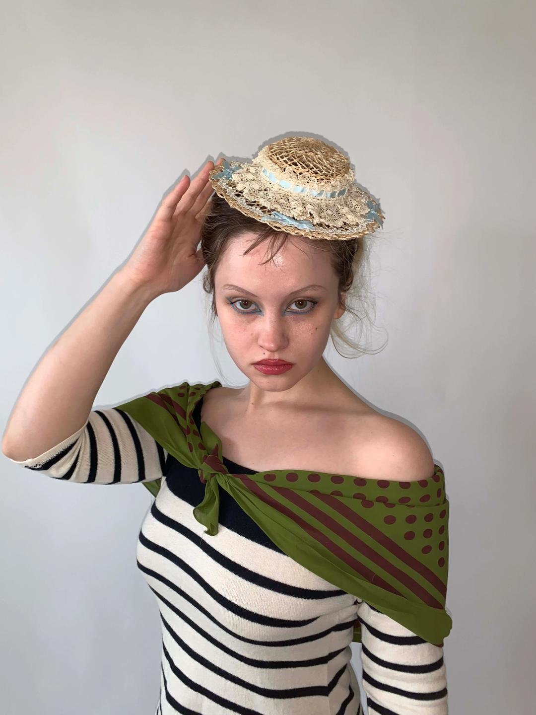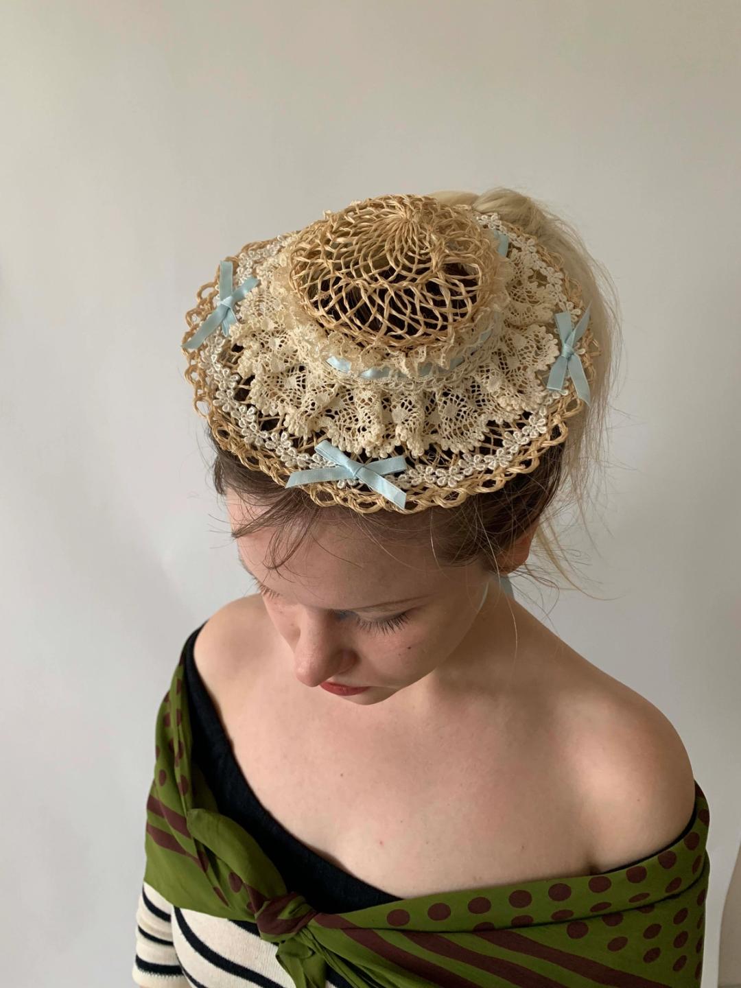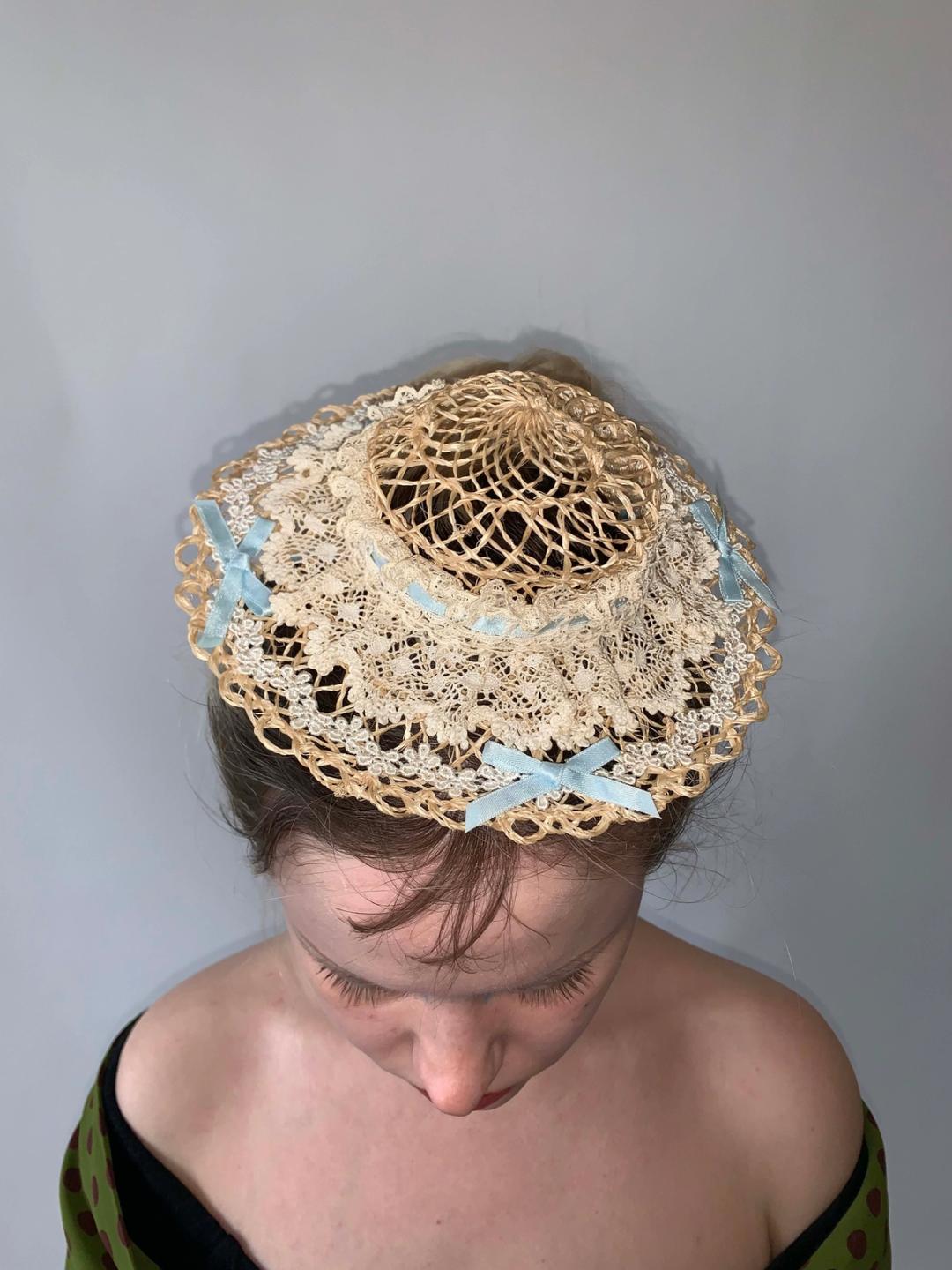 Lovely mini straw boater with baby blue ribbon tie. The hat is a reproduction of 1890s hat styles. The hat is made of delicate straw, lace, and ribbon but is sturdy and wearable. Enjoy an antique hat style without the worry of deterioration!