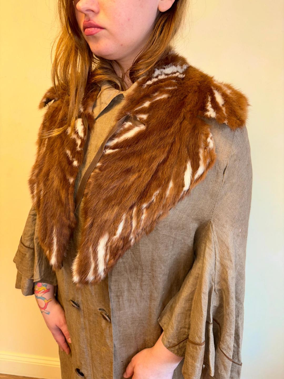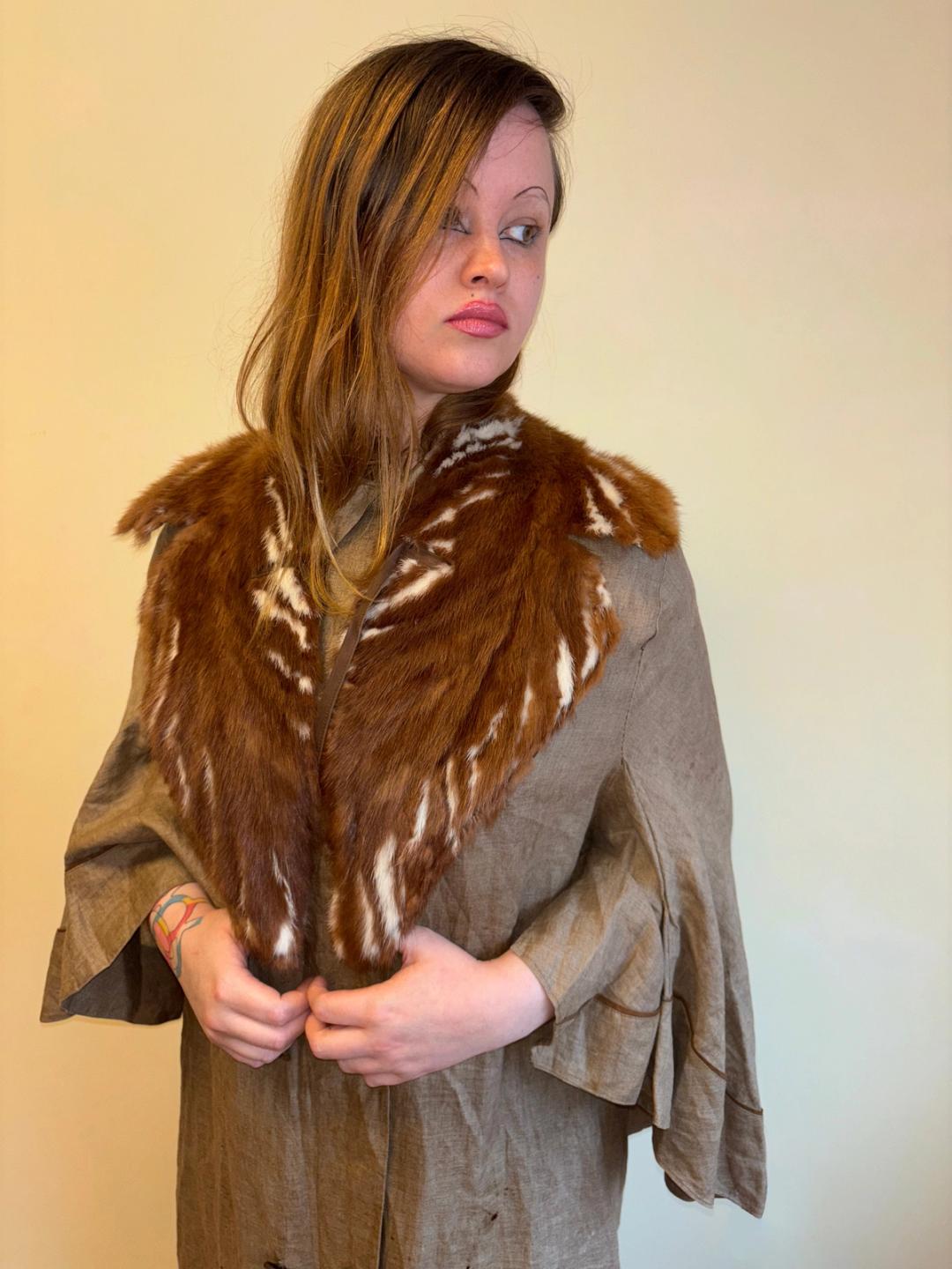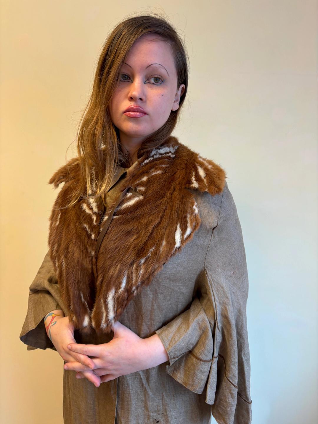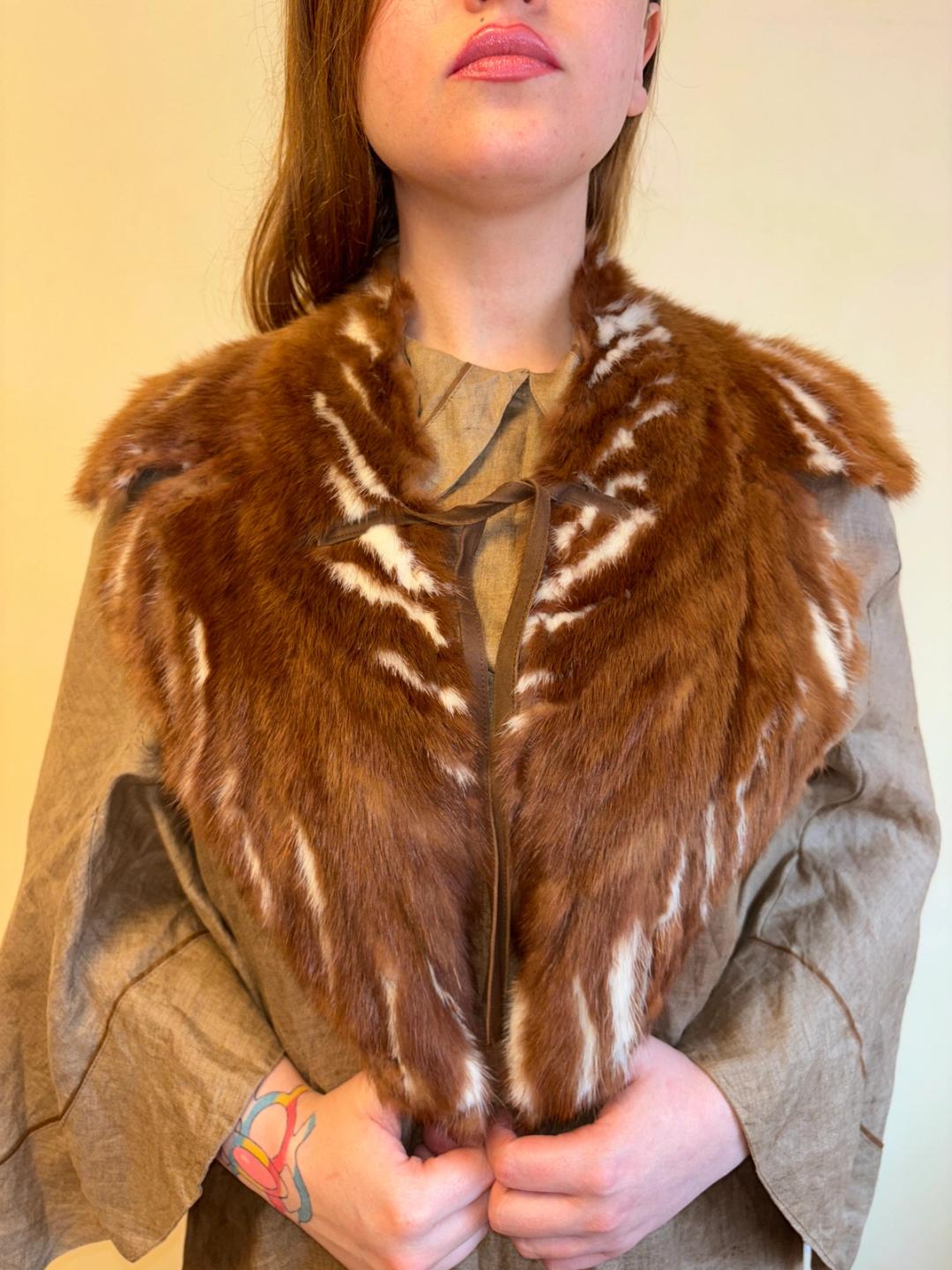 Repurposed mink collar from a 1940s jacket. The collar is leather lined and has leather ties in the front. The collar is a gorgeous and unique brown and white color.