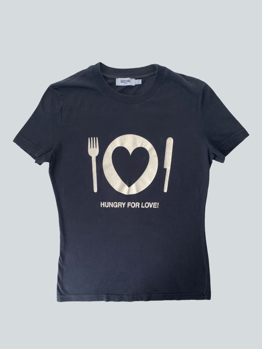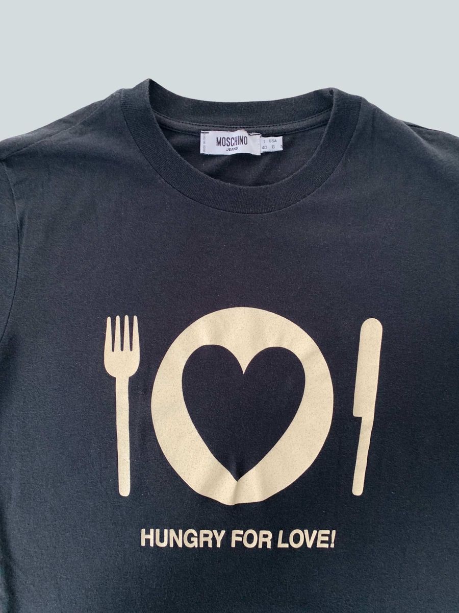 Adorable early 2000s t-shirt by Moschino Jeans that says "Hungry for Love." The text is shown along with a heart served on a plate. Stretch cotton for a fitted silhouette. In excellent vintage condition. Bon appétit!