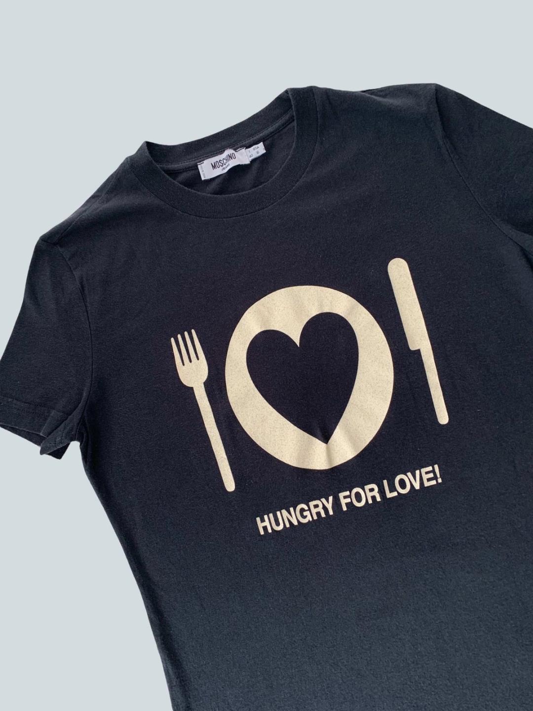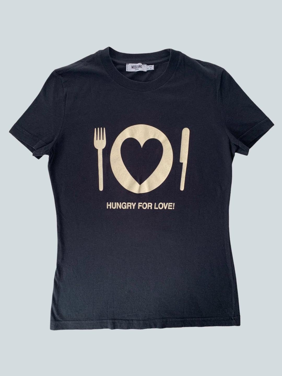 Adorable early 2000s t-shirt by Moschino Jeans that says "Hungry for Love." The text is shown along with a heart served on a plate. Stretch cotton for a fitted silhouette. In excellent vintage condition. Bon appétit!