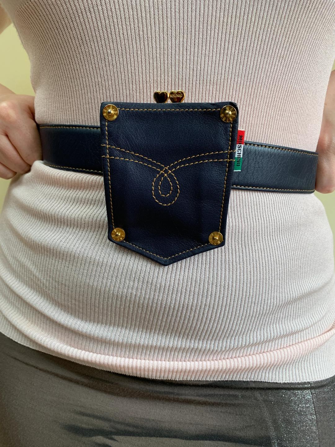 Adorable belt by Moschino with an attached mini purse that imitates a jean pocket. The purse has a kiss lock closure with a heart design. The purse can be moved around on the belt into different positions -- see the photos. The belt fits between 25” to 29” waist.