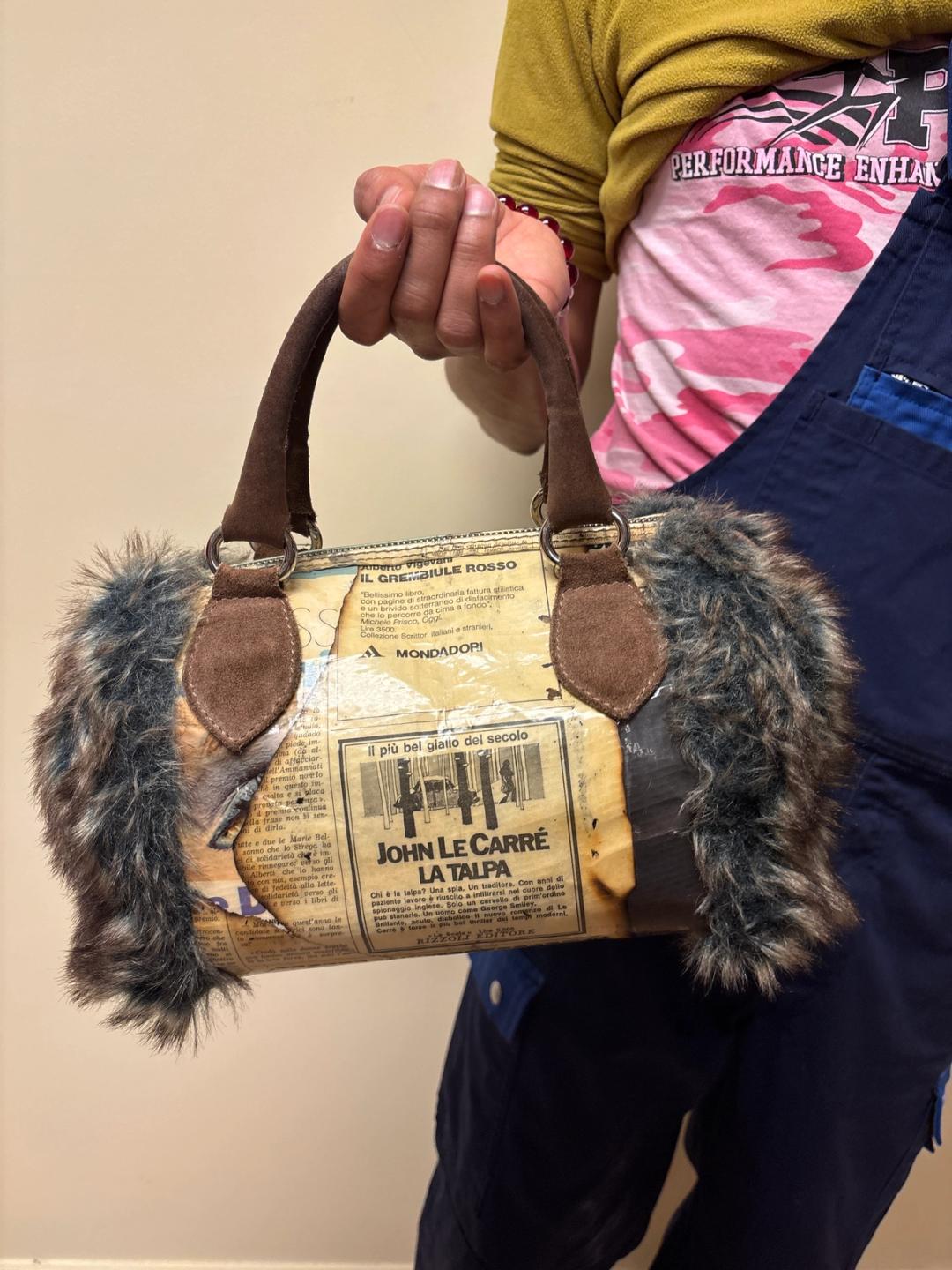 Newsprint and faux fur purse by an Italian brand. It can be a handbag or it comes with a long over the shoulder strap that can be attached.