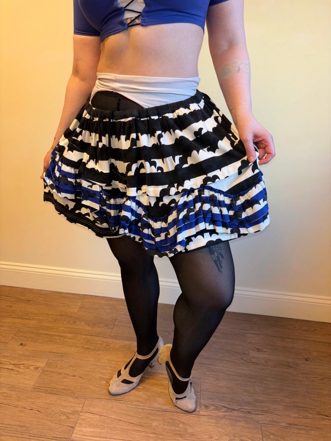 Nozomi Ishiguro voluminous shorts with bat motif throughout. Gathered drawstring waist and voluminous cut makes it look like a skirt. Here it is shown on the waist but can also be worn low on the hips. Soft cotton sweatshirt fabric, excellent condition. Fairly free size.