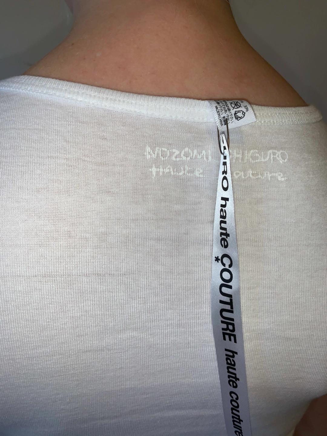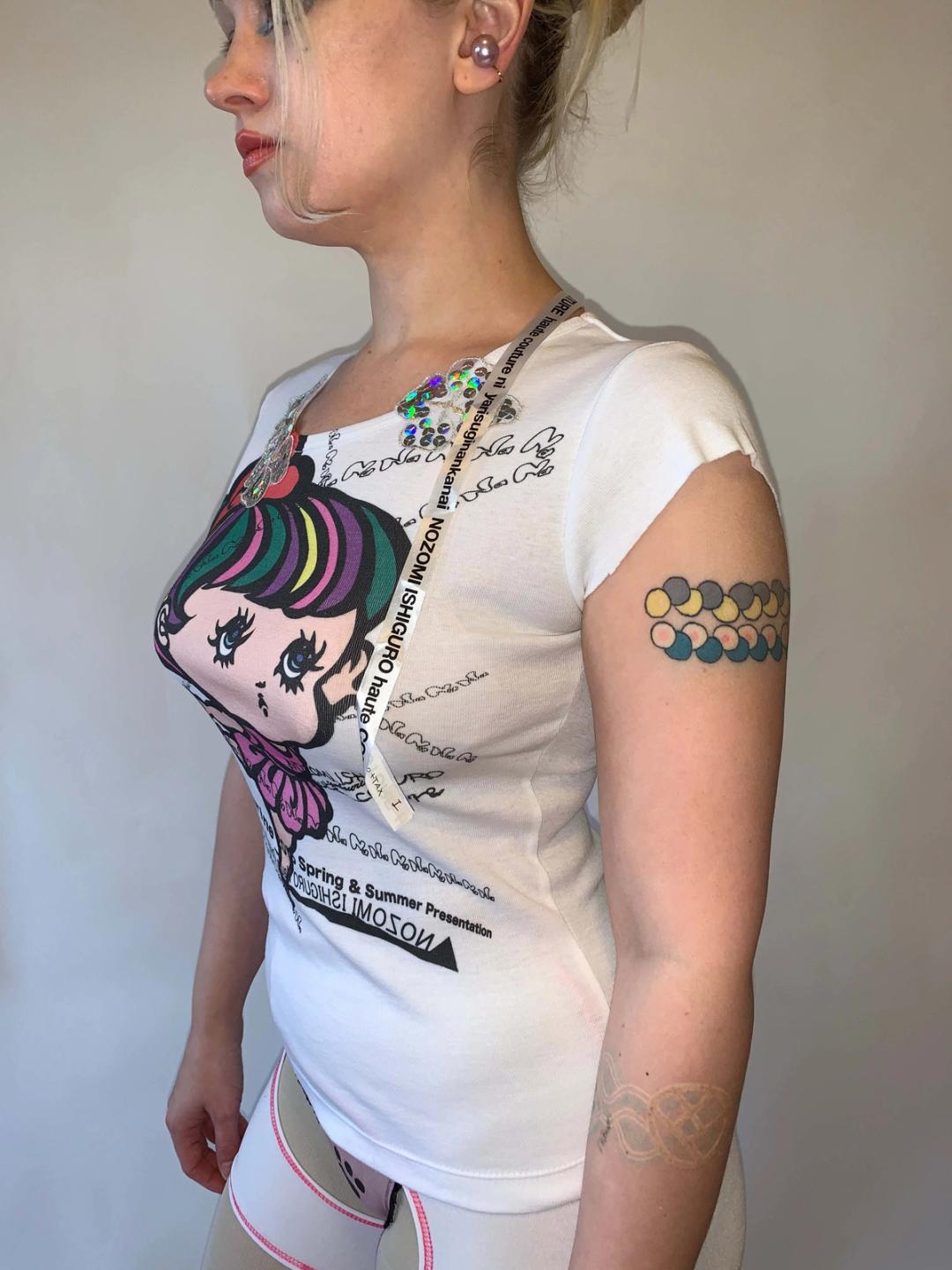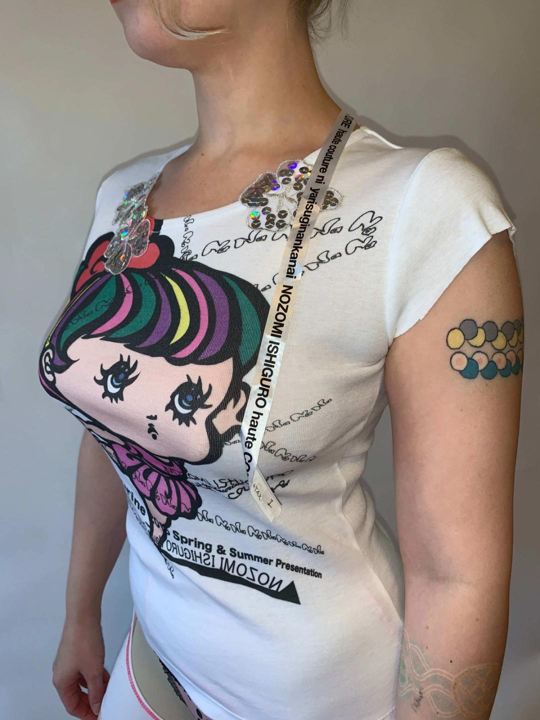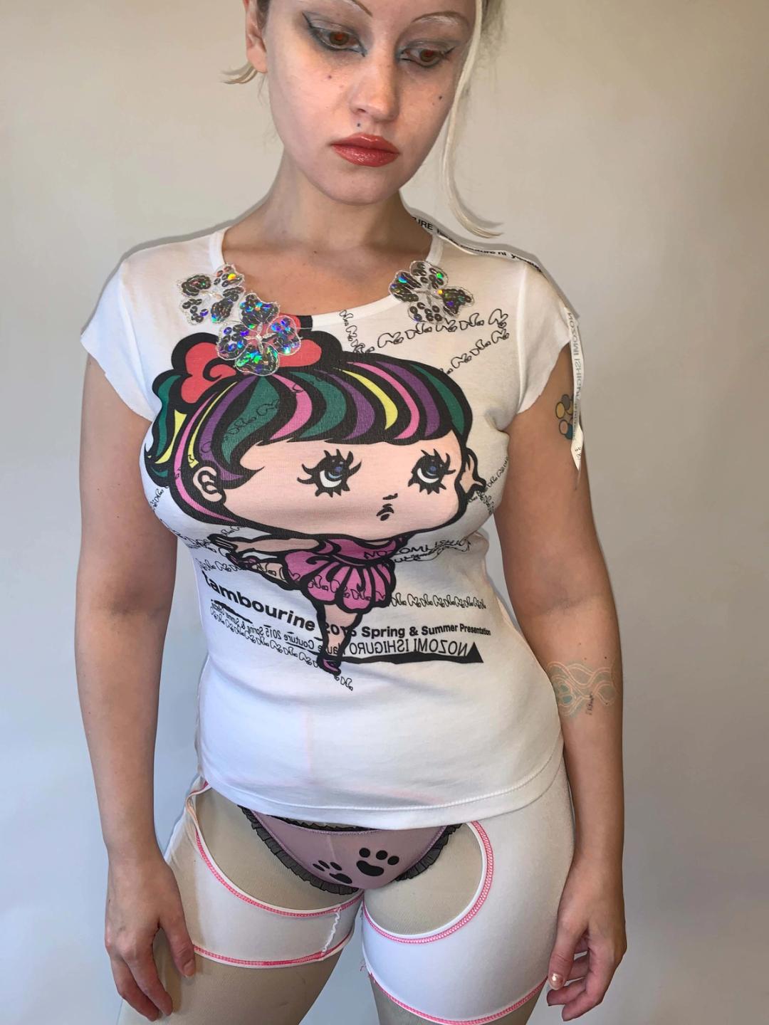 Rare t-shirt by designer, Nozomi Ishiguro. The shirt features an adorable doll girl illustration and a layered collage like text print. There are sequin flower appliqués and an exaggerated long ribbon tag on the back.