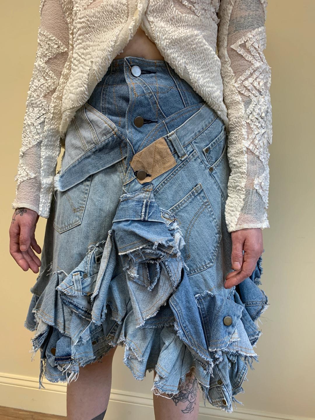 One-of-a-kind Nozomi Ishiguro denim patchwork composite skirt made of repurposed jeans. The skirt has many buttons down the front and a high waist. There's a ruffle trim design.