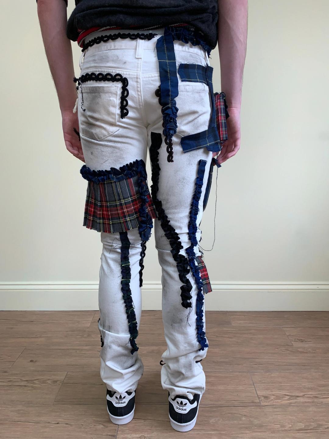 One-of-a-kind Nozomi Ishiguro patchwork skinny jeans. The jeans have lots of patches, trimmings, and ruffles throughout. Unisex.