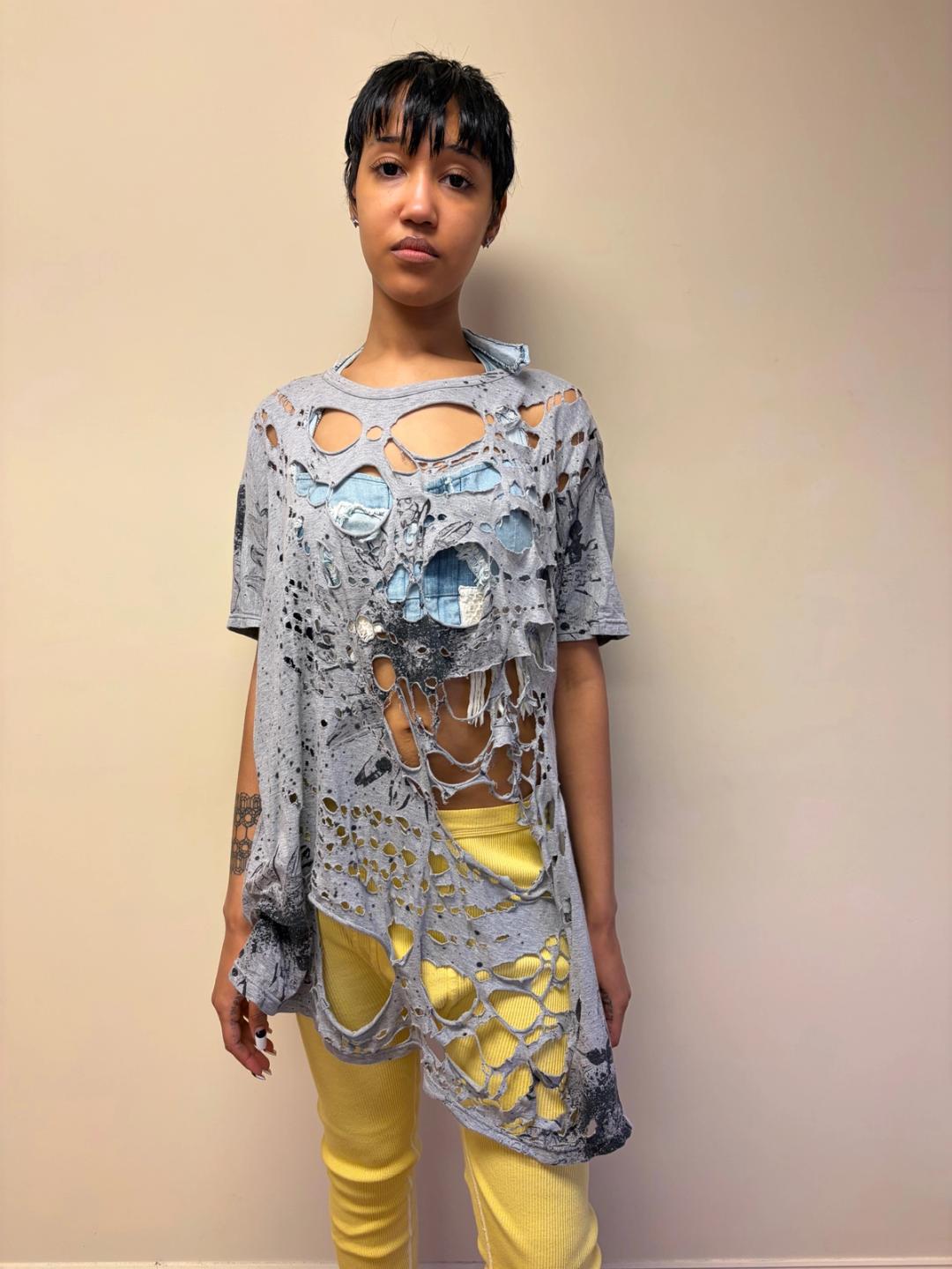 Nozomi Ishiguro shredded tunic with abstract flower print. Shredded to perfection! Unisex.