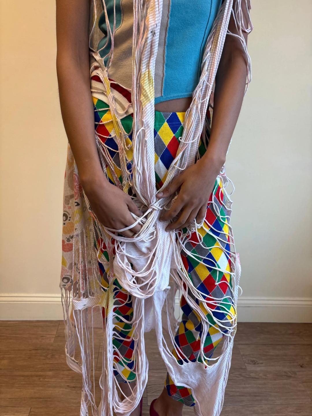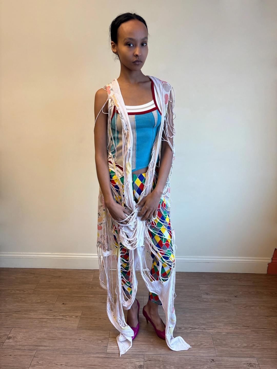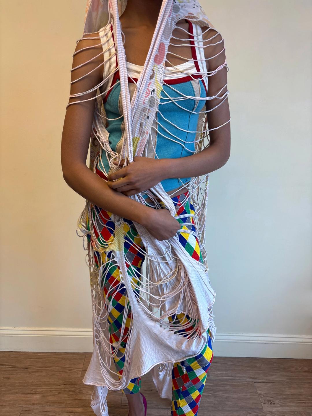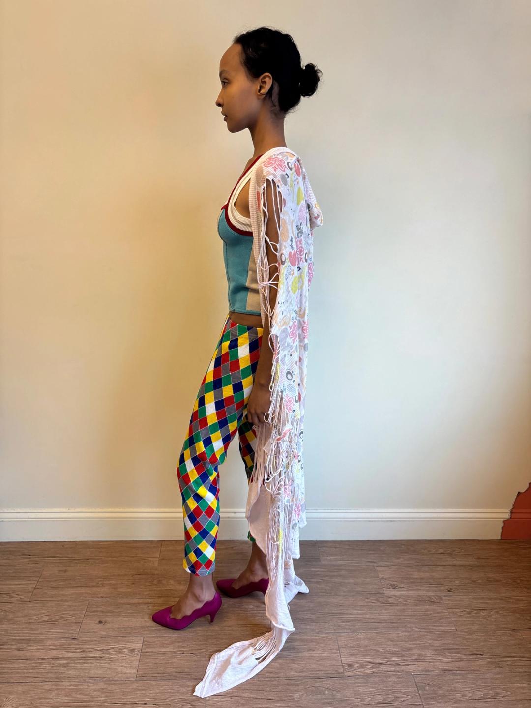 A very beautiful and versatile slashed shawl by Nozomi Ishiguro. Due to the slashes throughout the garment, it can be styled and worn in so many different ways. The soft t-shirt cotton textile is pale pink with childish, abstract paisleys, shields, and floral designs. The shawl is new with its original tags and is open size.