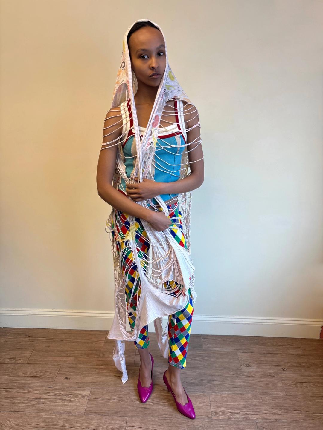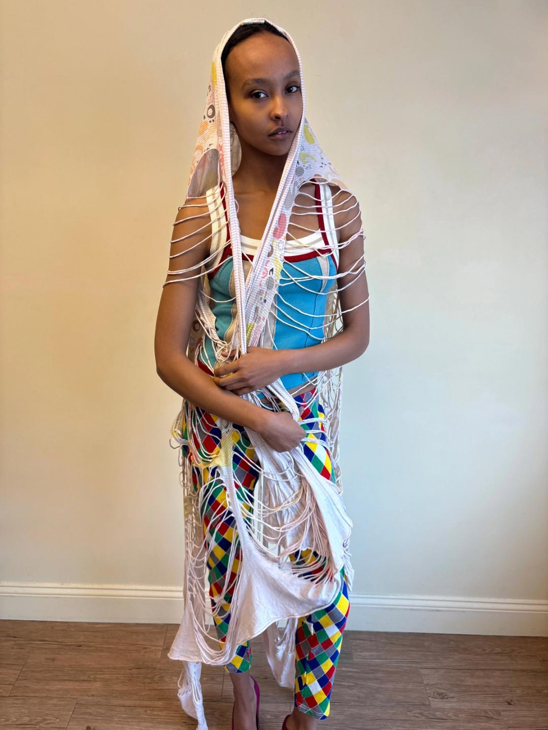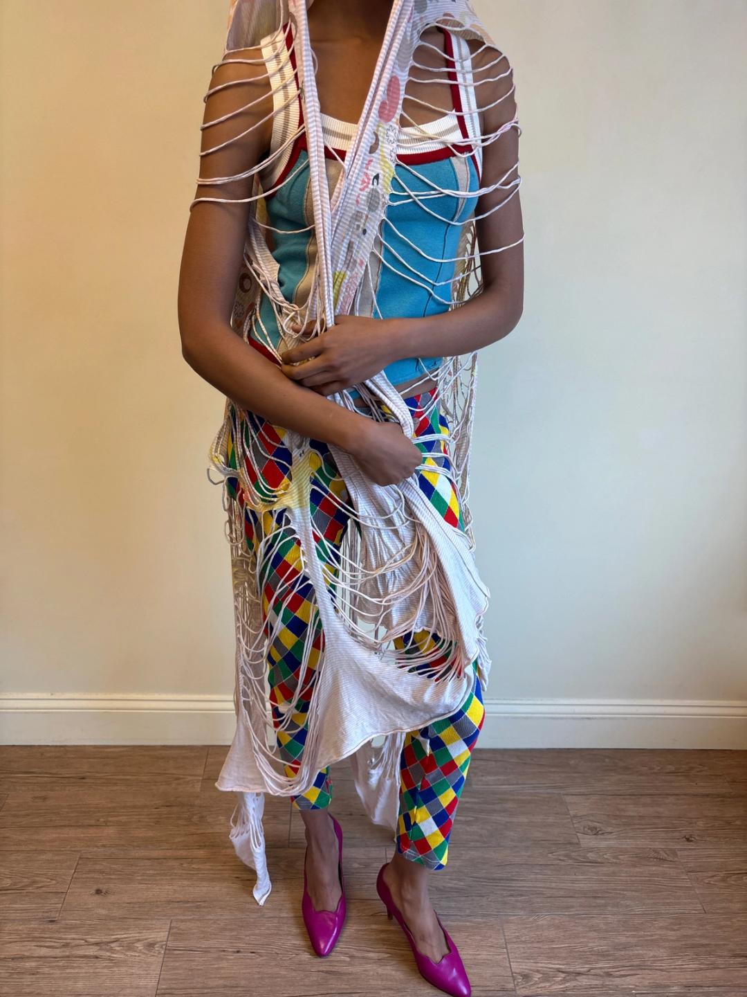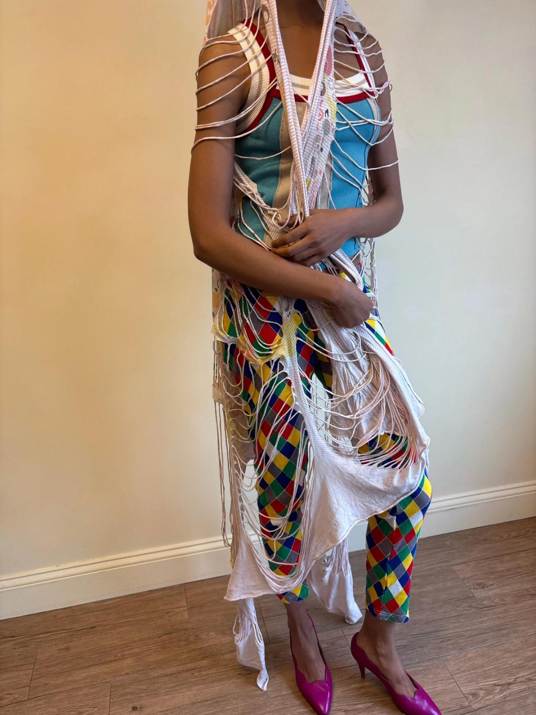 A very beautiful and versatile slashed shawl by Nozomi Ishiguro. Due to the slashes throughout the garment, it can be styled and worn in so many different ways. The soft t-shirt cotton textile is pale pink with childish, abstract paisleys, shields, and floral designs. The shawl is new with its original tags and is open size.