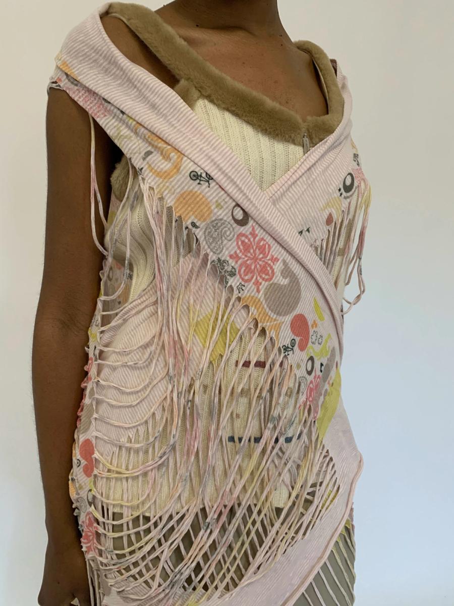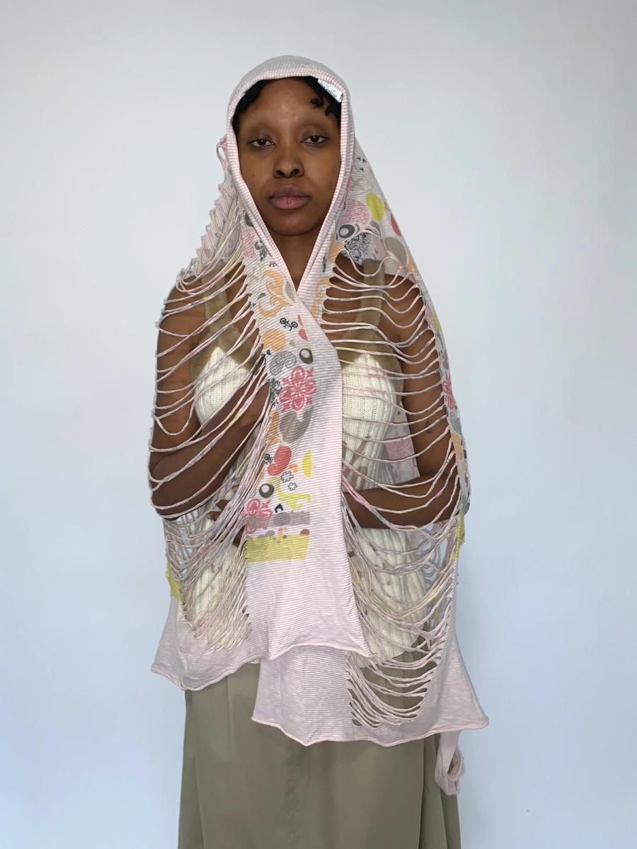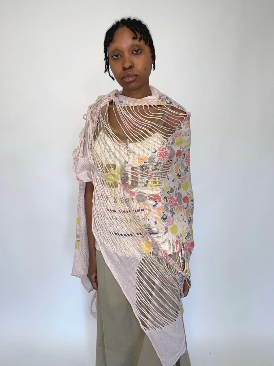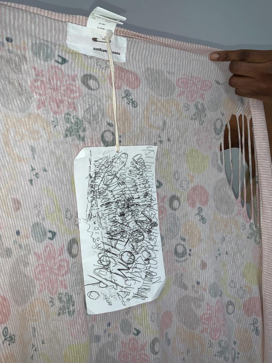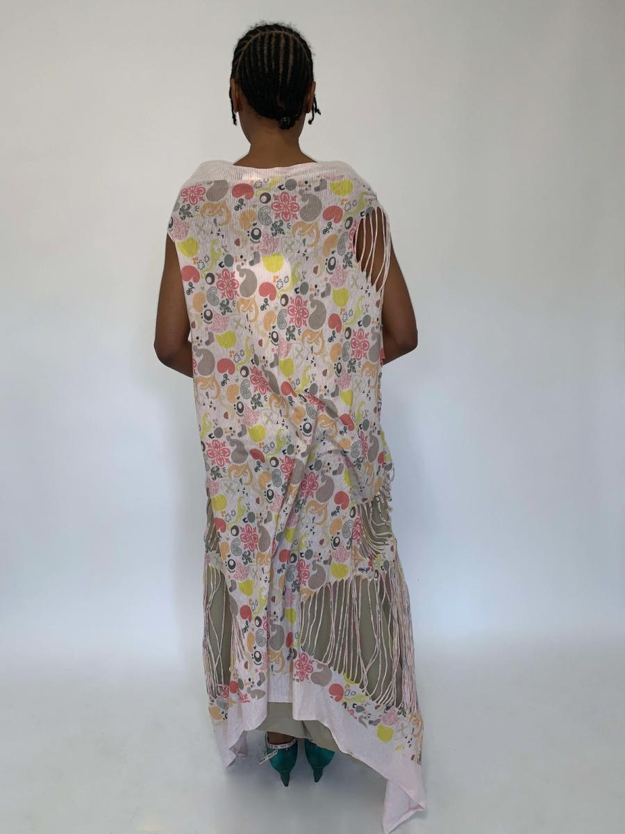 A very beautiful and versatile slashed shawl by Nozomi Ishiguro. Due to the slashes throughout the garment, it can be styled and worn in so many different ways. The soft t-shirt cotton textile is pale pink with childish, abstract paisleys, shields, and floral designs-- perhaps a cheeky reference to traditional European ladies' shawls from the 18th-19th c which often were decorated with Paisleys (a motif appropriated from Indian textiles). The shawl is new with its original tags and is open size.