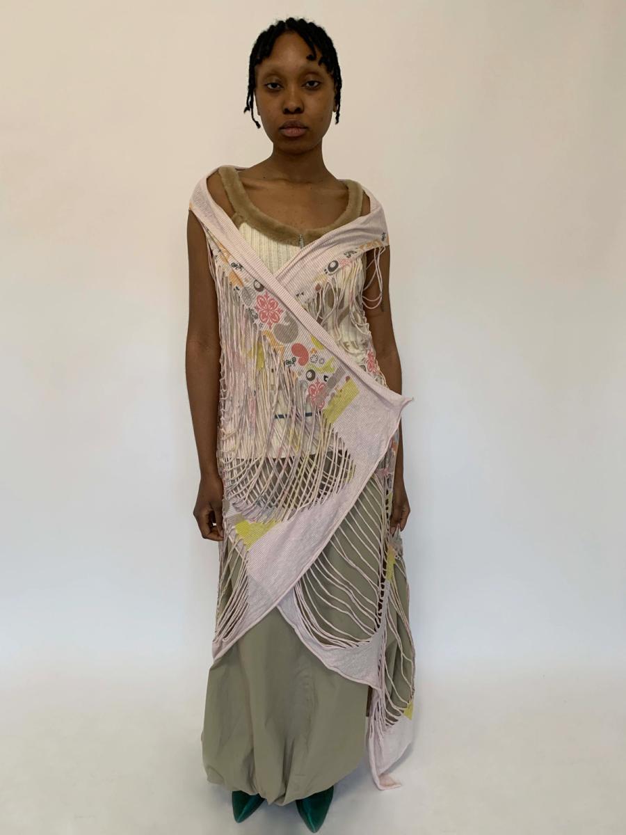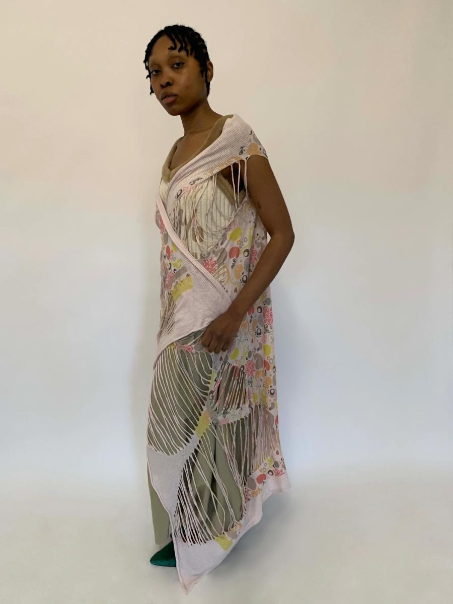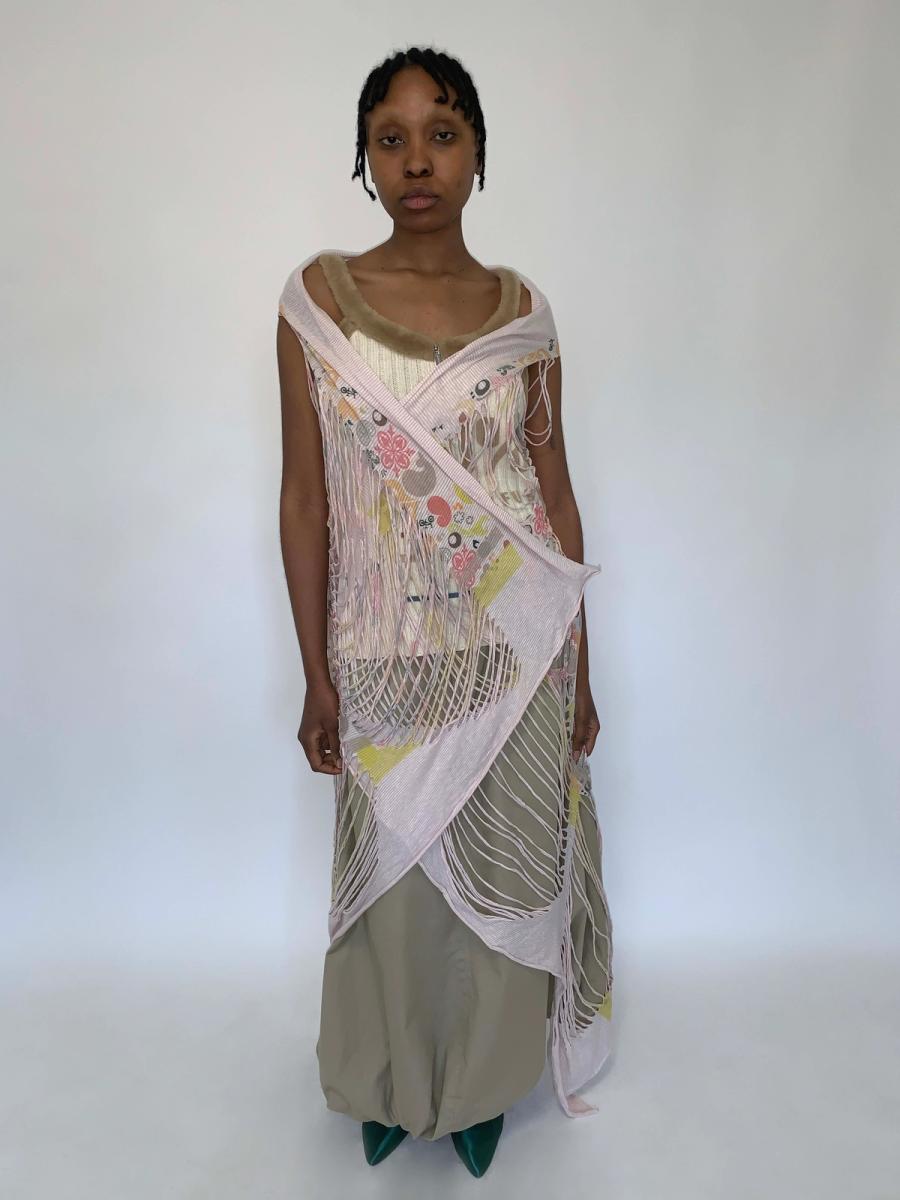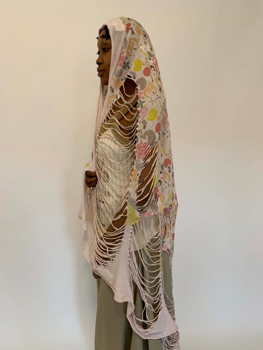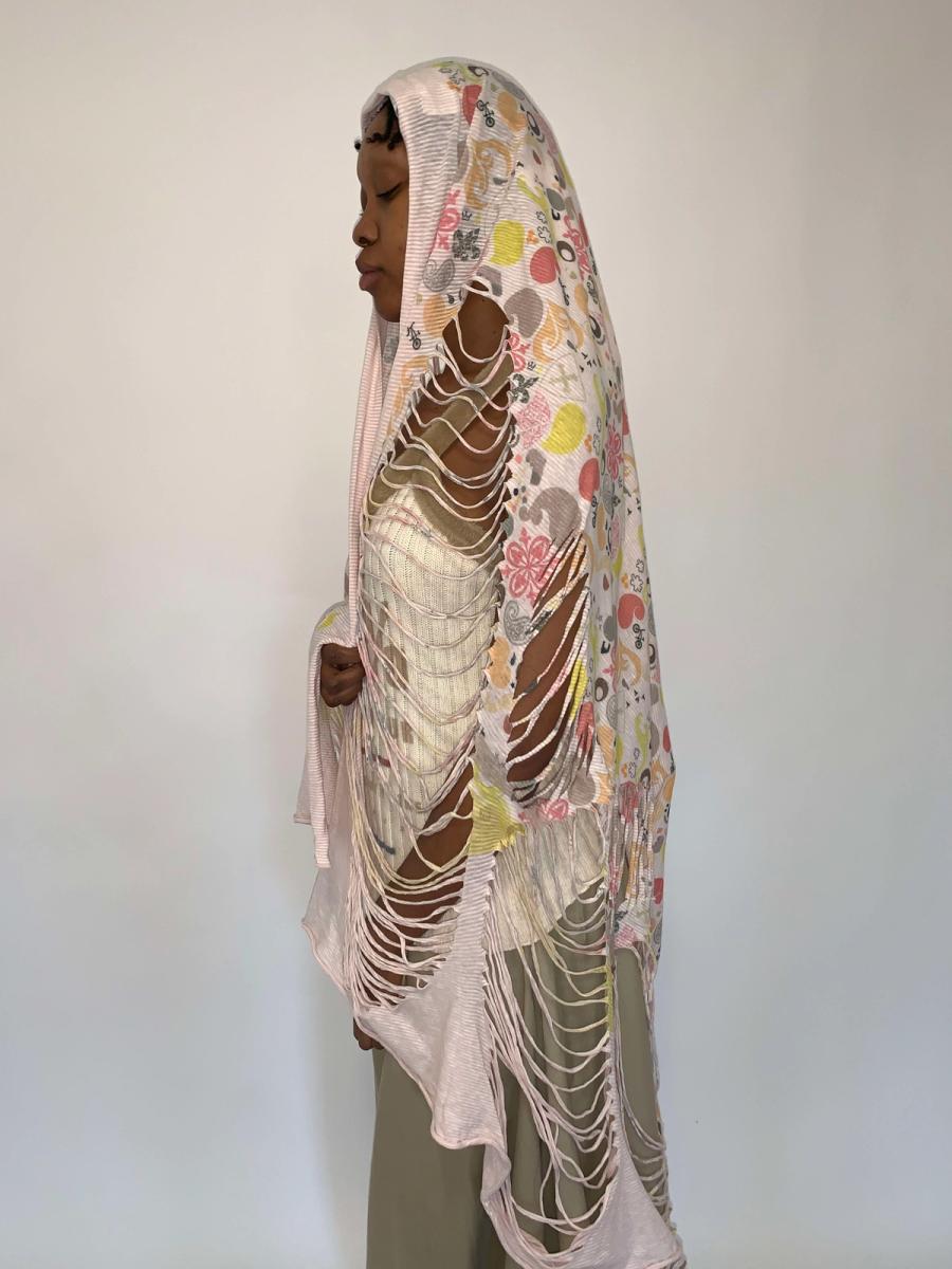 A very beautiful and versatile slashed shawl by Nozomi Ishiguro. Due to the slashes throughout the garment, it can be styled and worn in so many different ways. The soft t-shirt cotton textile is pale pink with childish, abstract paisleys, shields, and floral designs-- perhaps a cheeky reference to traditional European ladies' shawls from the 18th-19th c which often were decorated with Paisleys (a motif appropriated from Indian textiles). The shawl is new with its original tags and is open size.