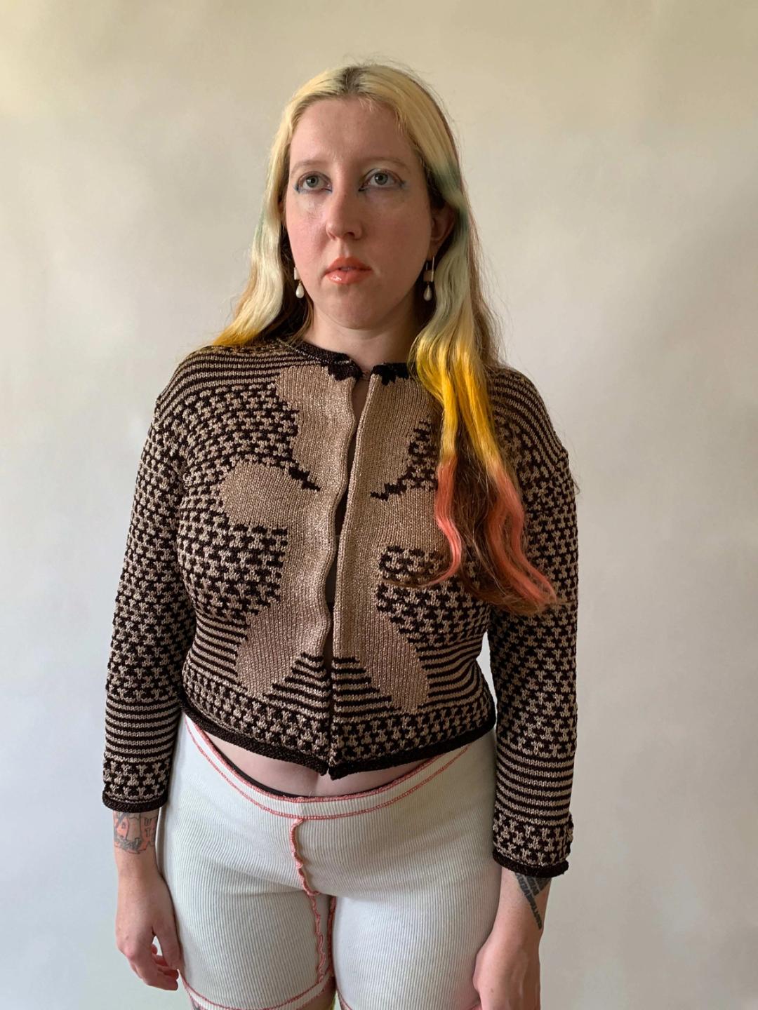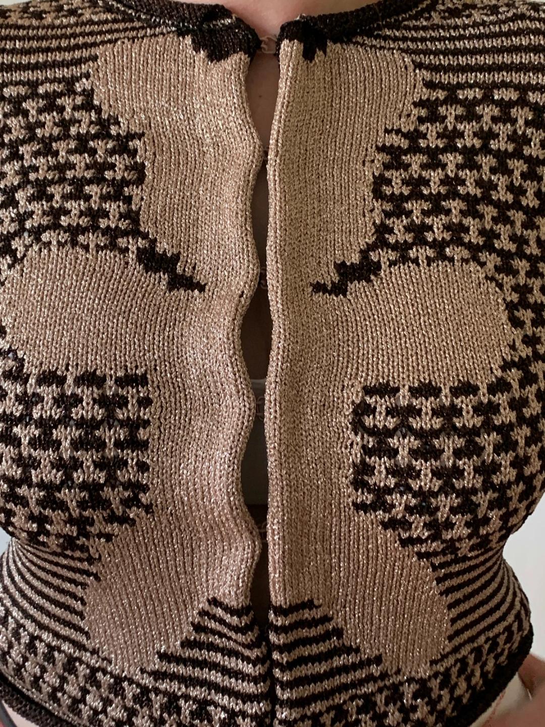 Vintage and rare sweater by Nozomi Ishiguro Haute Couture featuring a knit teddy bear design. The sweater is made of an interesting iridescent and stretchy textile. Due to the knit's elastic nature it is a fitted style and could fit a variety of sizes. It has hook and eye closures down the front. Labeled One Size.
