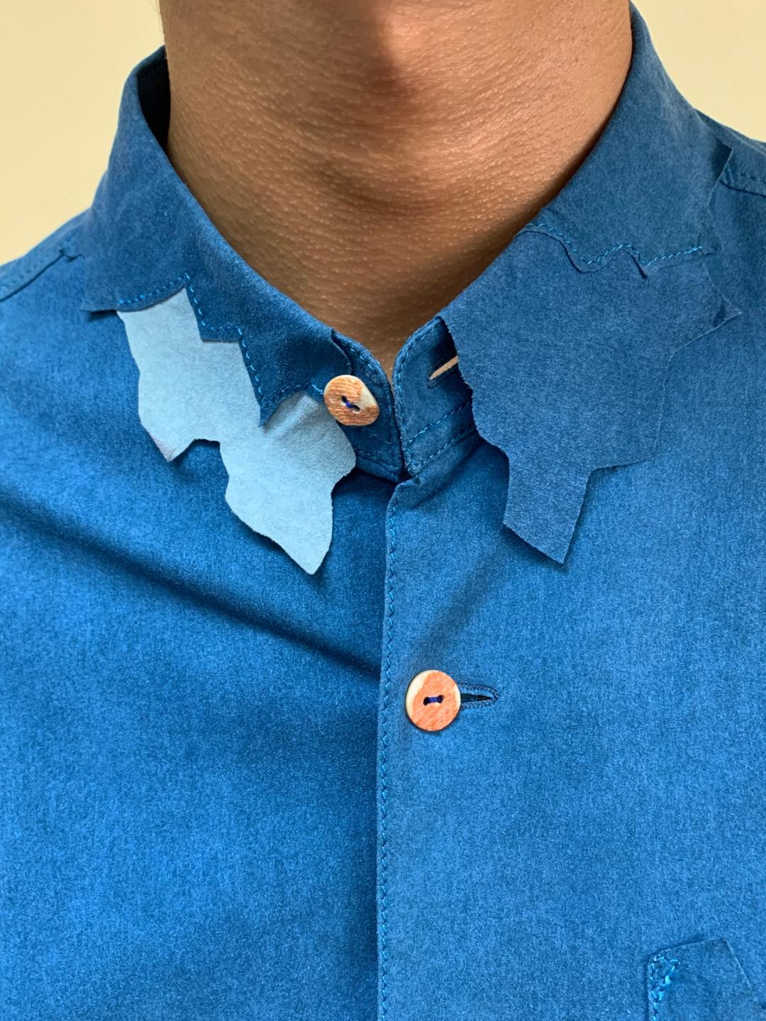 An ODOB faux suede button up with artisanal jagged edges on the cuff, collar, and pocket. It has MOP buttons up the front and at the cuffs. It has a relaxed fit. This is rare unworn sample from Obscure Desire of Bourgeoisie. Pristine.