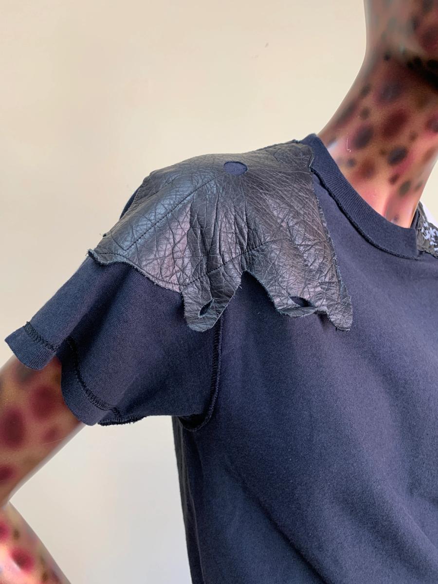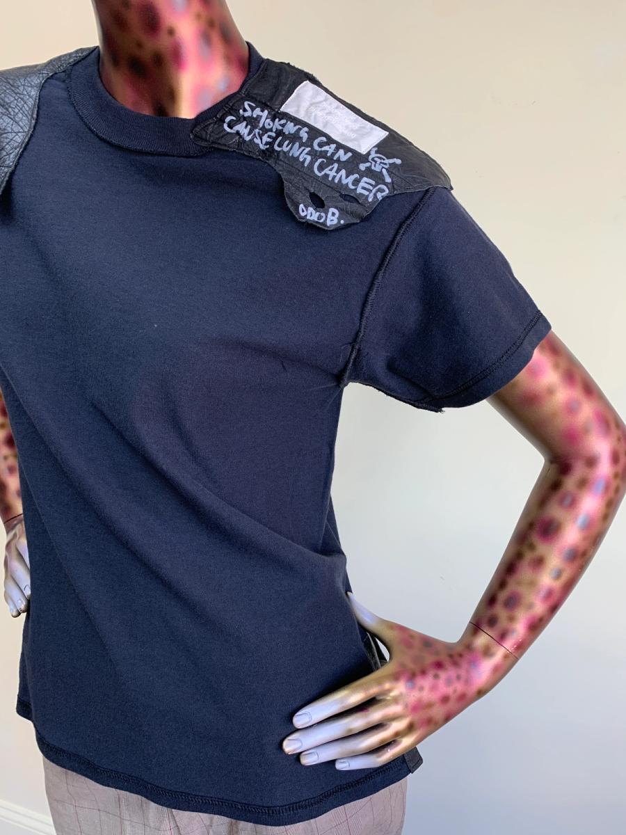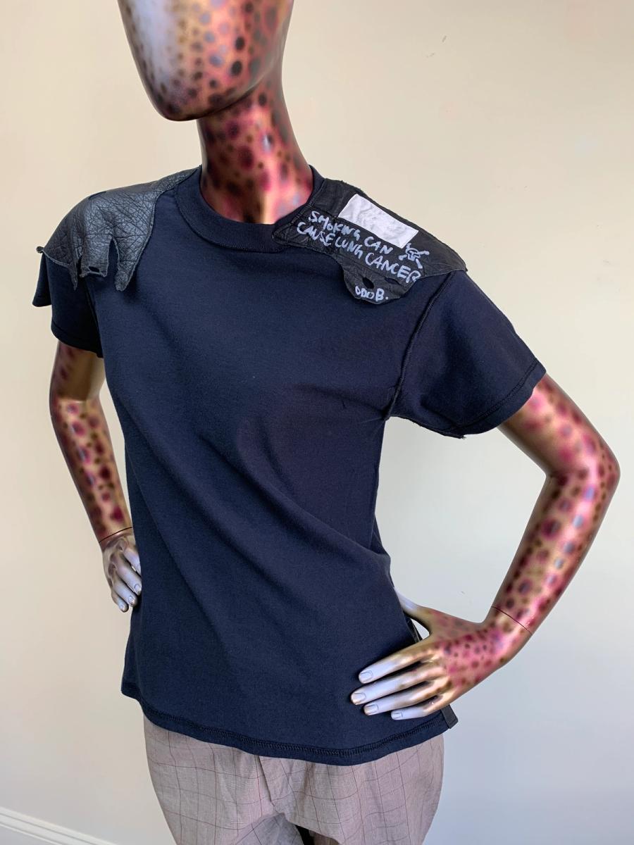 Rare 90s Obscure Desire of Bourgeoisie t-shirt. The shirt has leather patches on the top -- one reads "Smoking Can Cause Lung Cancer -O.D.O.B." in marker. There's a visible O.D.O.B. tag on the shoulder as well. In excellent vintage condition. Unisex.