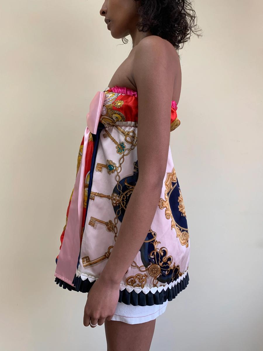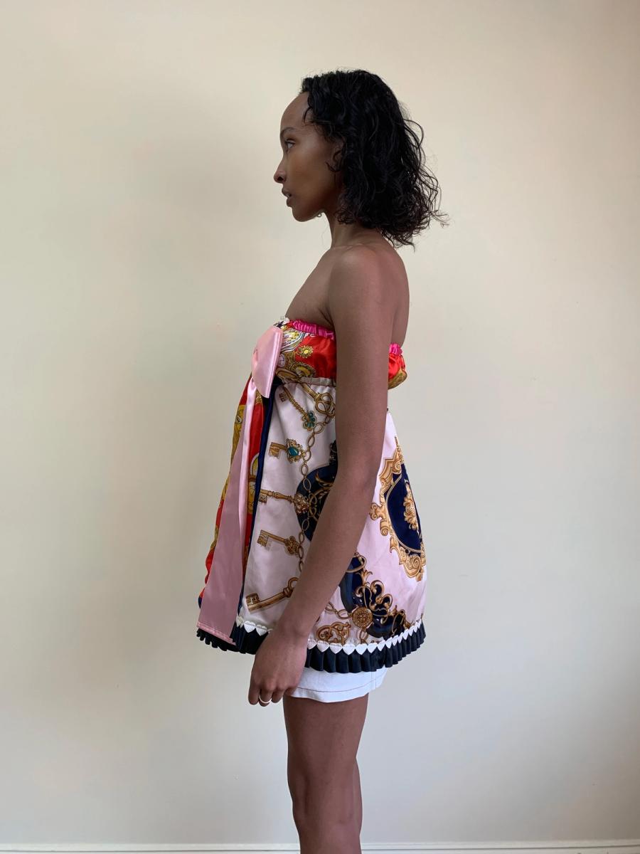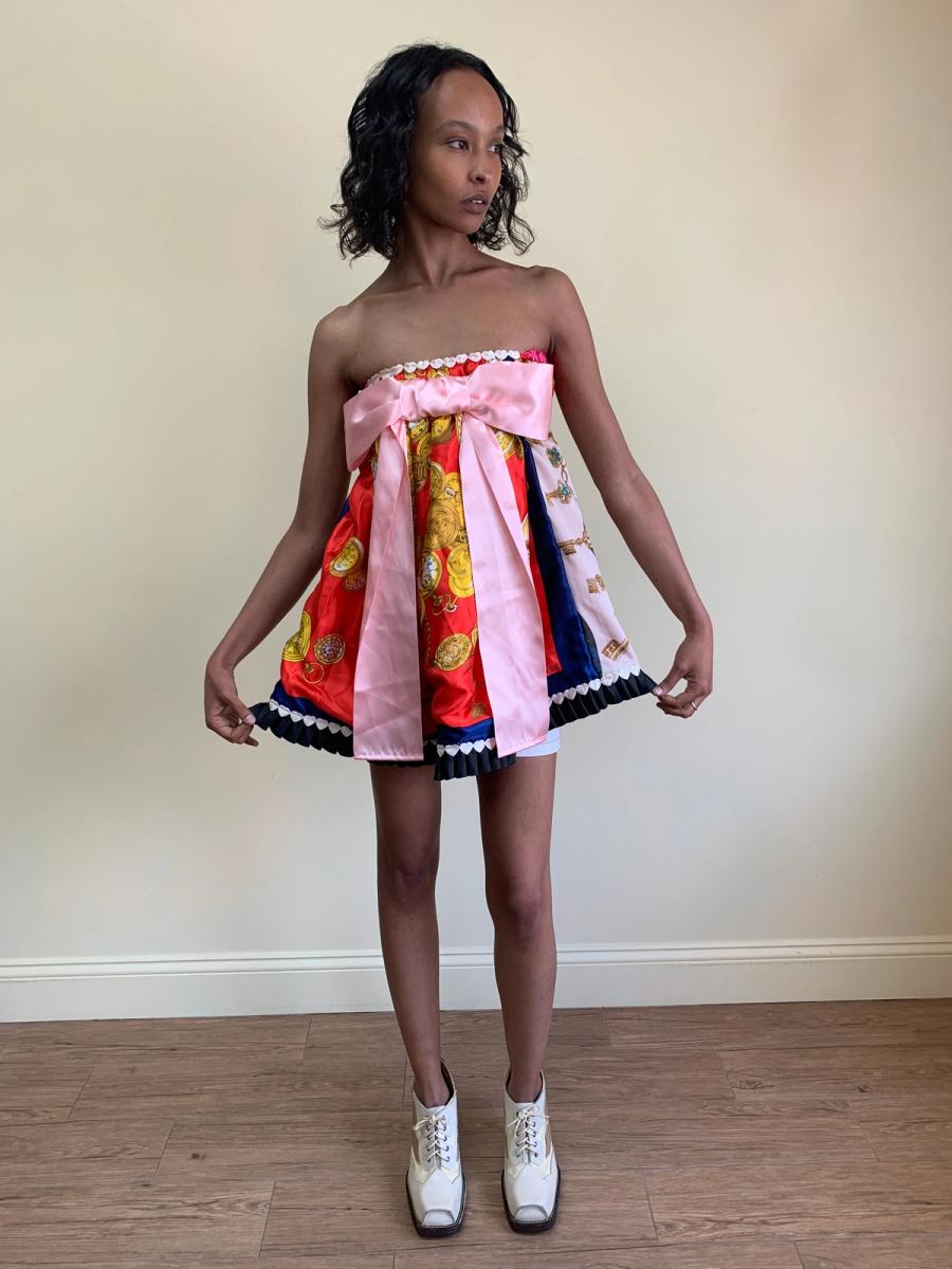 One-of-a-kind Glamorous Jane patchwork minidress made of vintage scarves. Fairly open size.