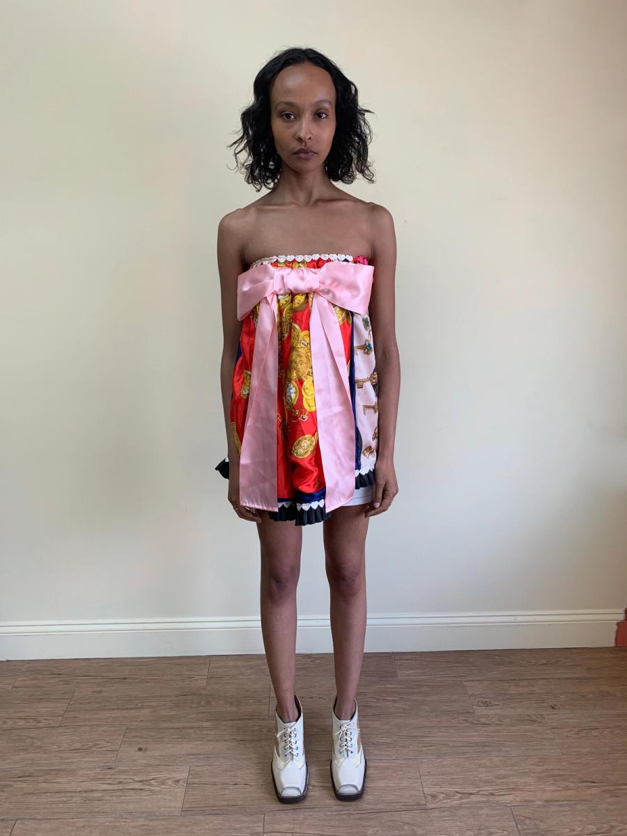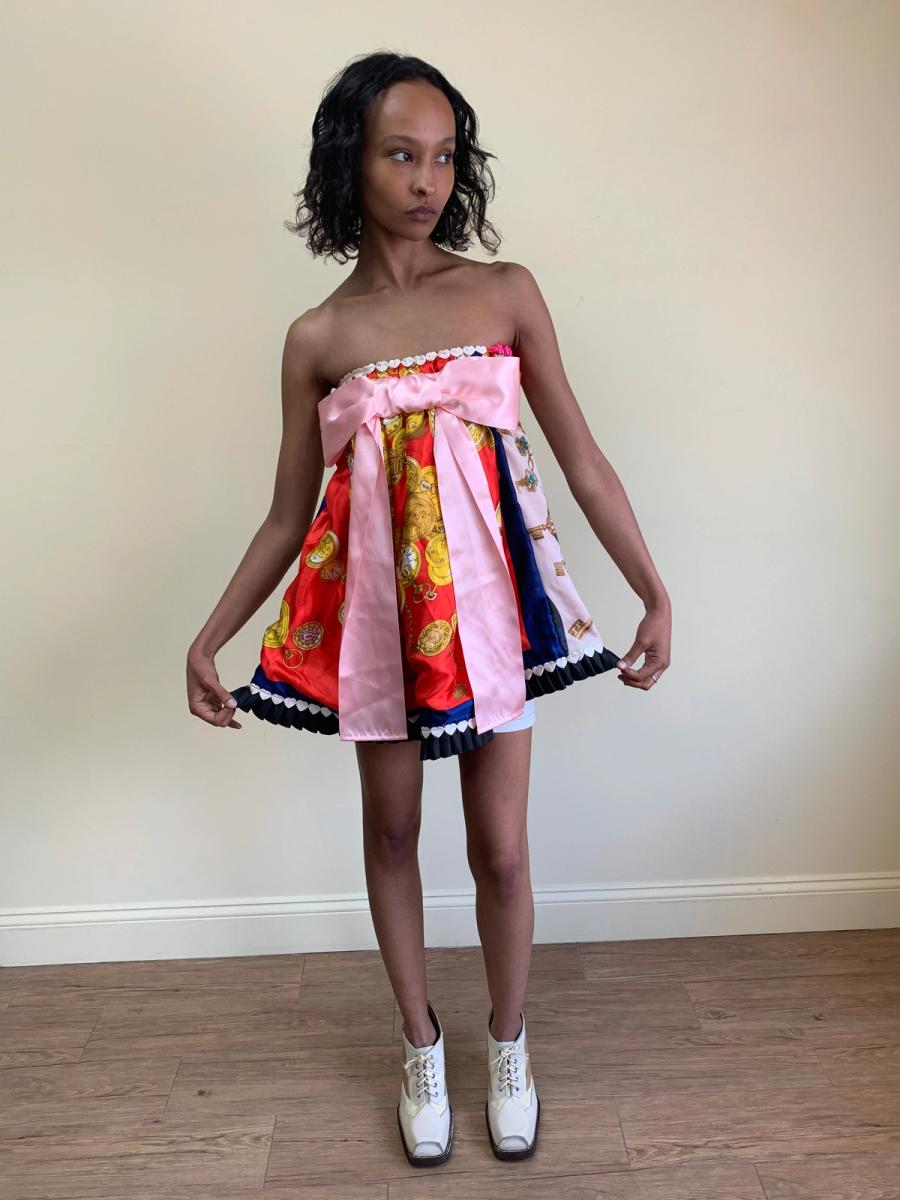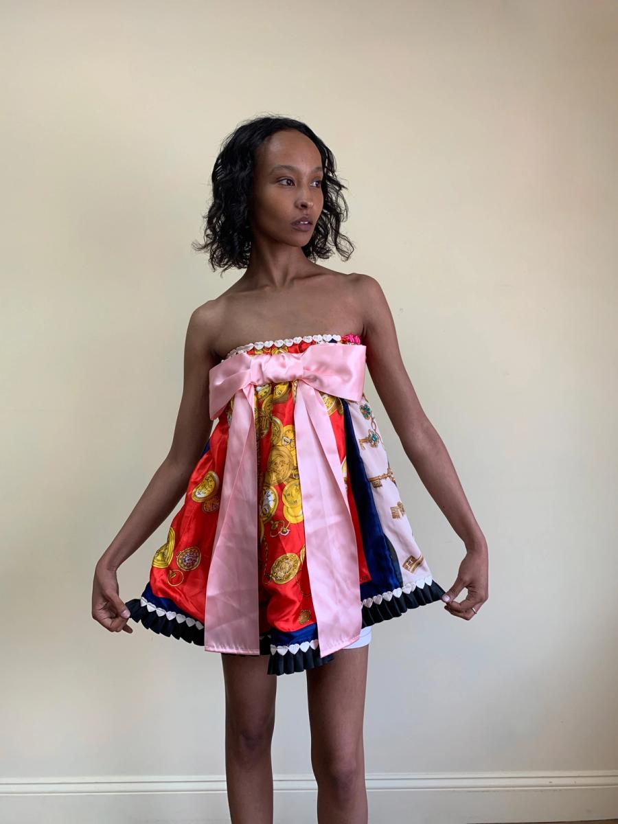 One-of-a-kind Glamorous Jane patchwork minidress made of vintage scarves. Fairly open size.