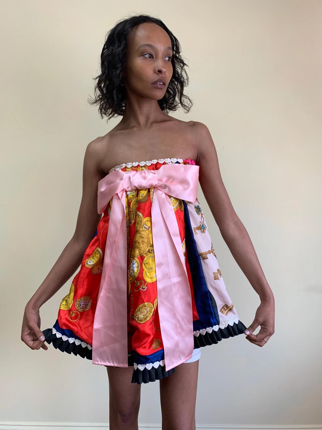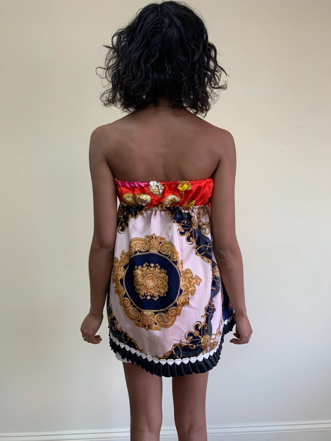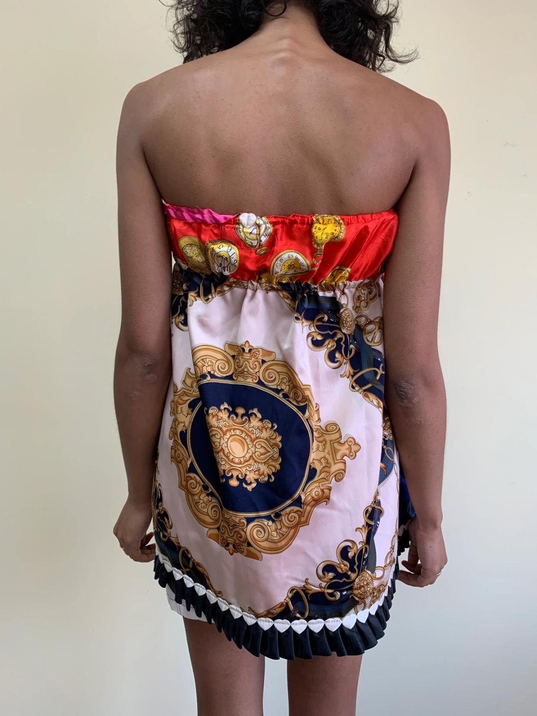 One-of-a-kind Glamorous Jane patchwork minidress made of vintage scarves. Fairly open size.