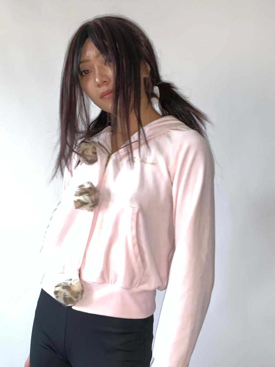 Vintage soft pastel pink velour sweat jacket with adorable bunny ears by Pink House. Fun faux fur leopard pompom detail down the front of the jacket. Glittery gold Pink House logo on the front as well.