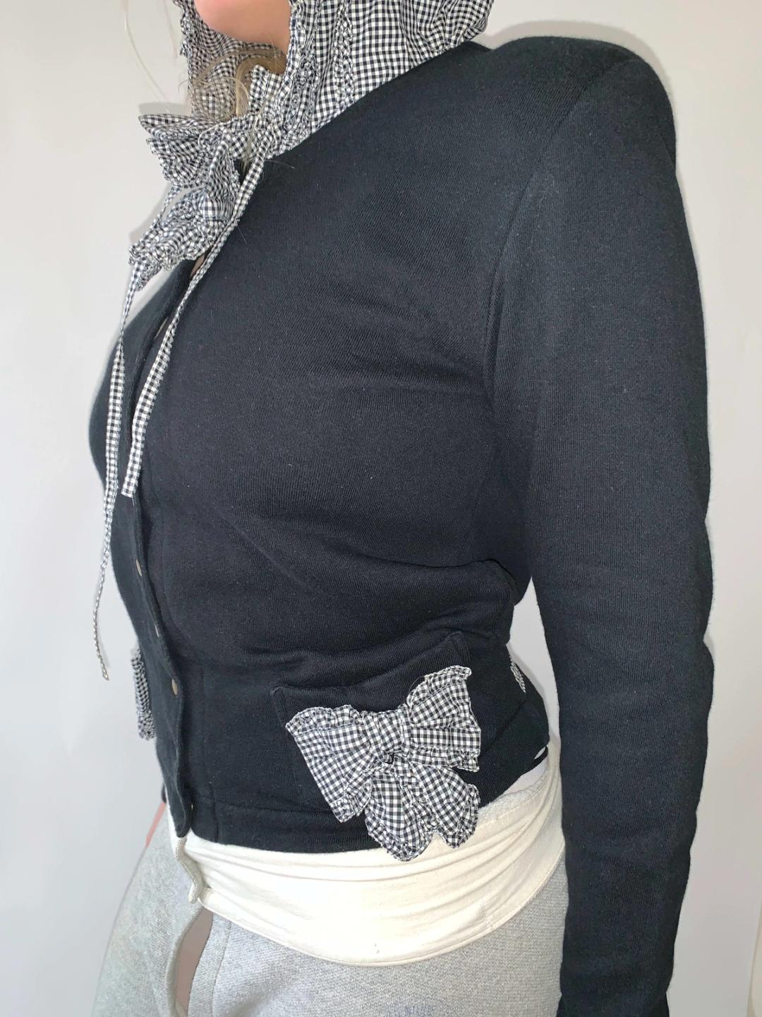 A precious design by Kaneko Isao's Pink House, a black snap cotton sweatshirt with Gingham hood and accents throughout. It has slim shoulder pads for a little structure as well as a cinching sash that ties at the back. "Pink House" is spelled in gingham patchwork on the back as well. In pristine condition. 100% Cotton. Made in Japan.