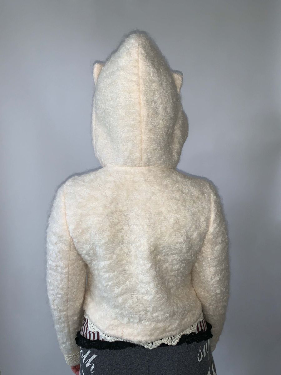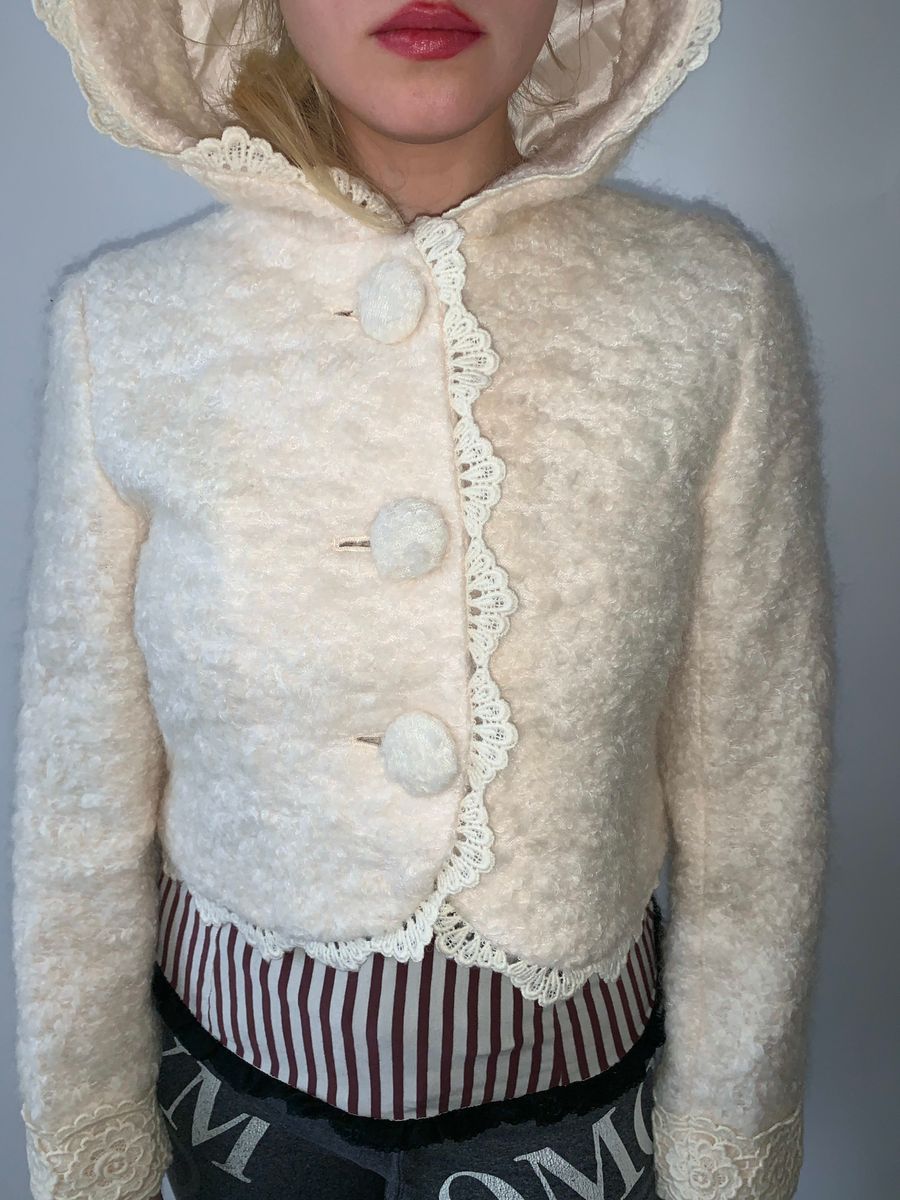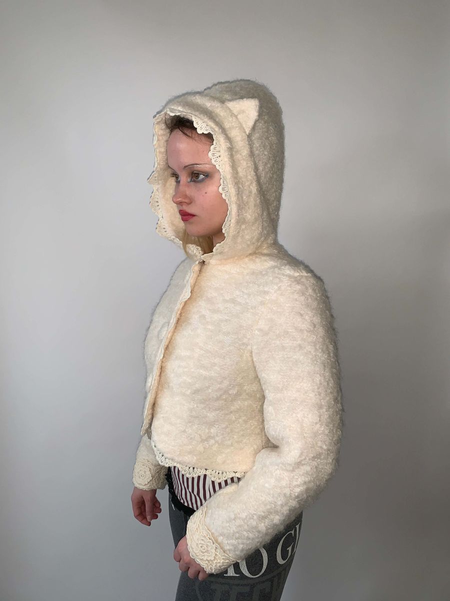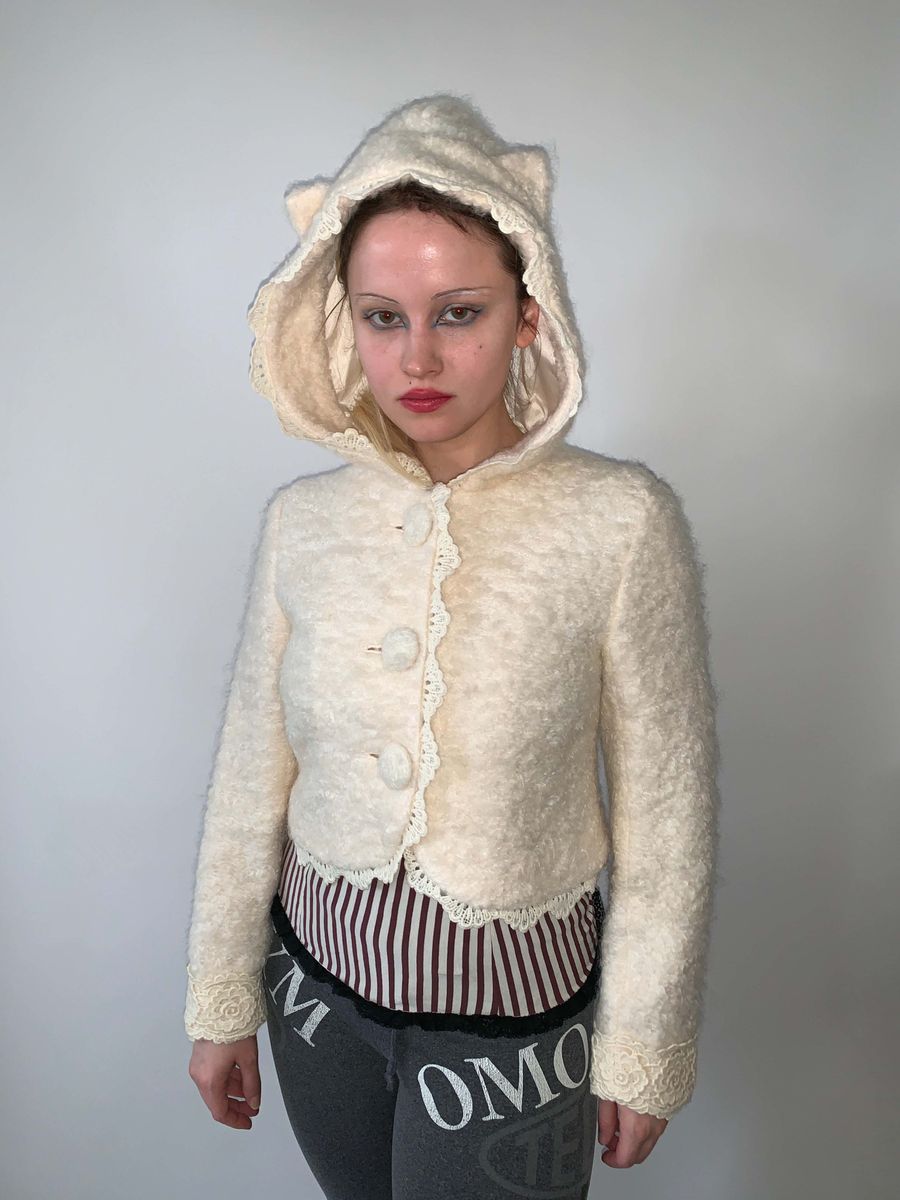 Adorable boucle jacket by cult label, Pink House. The jacket has a cat ear hood and large covered buttons down the front. There's a lovely white lace trim throughout!