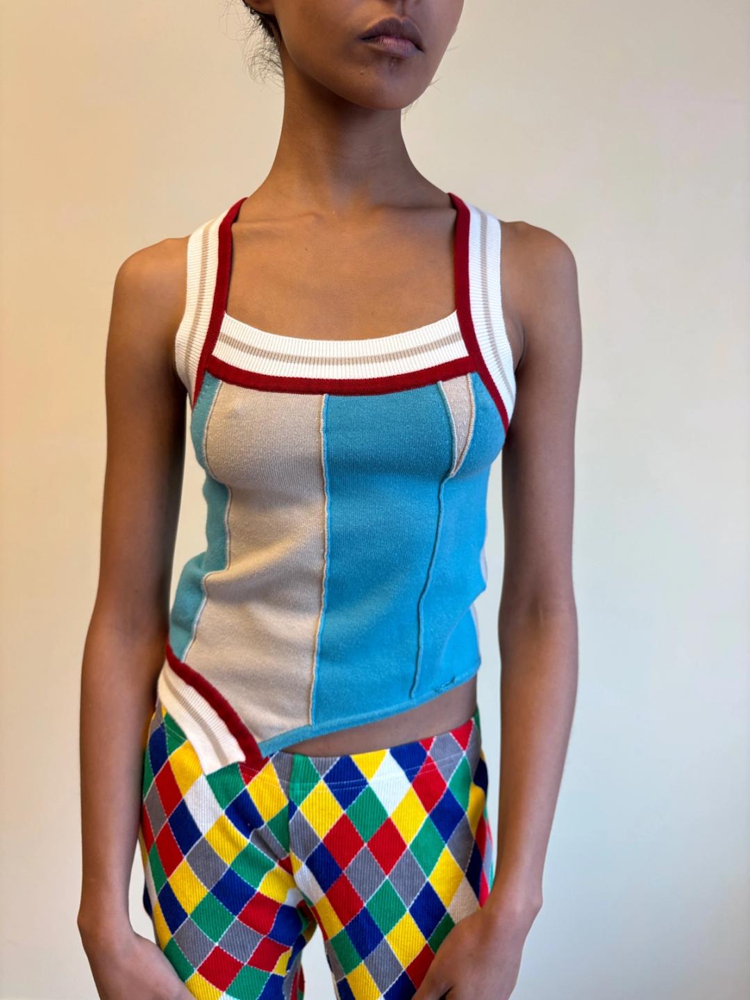 Plein Sud knit patchwork assemblage tanktop with ribbing throughout. Quite stretchy and fitted silhouette.