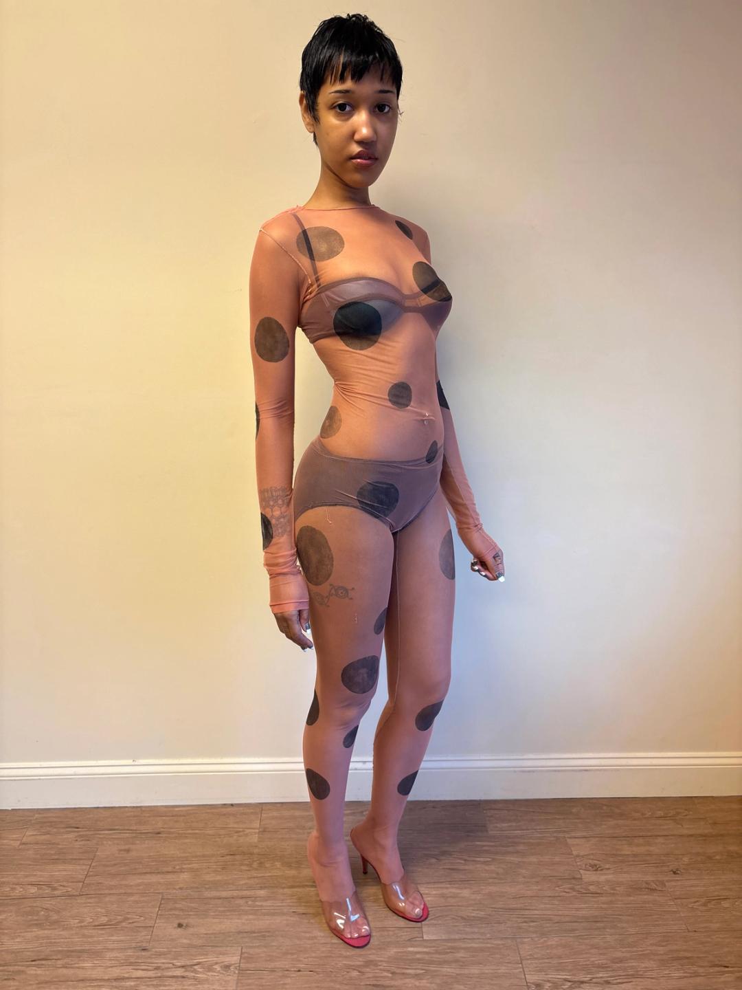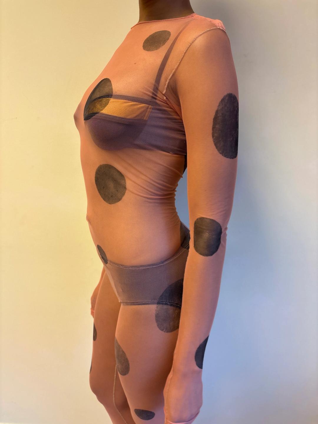 Hand-painted polka dot illusion net footed bodysuit. It has built in panties. It was originally a costume from a Berlin opera house. In excellent condition.