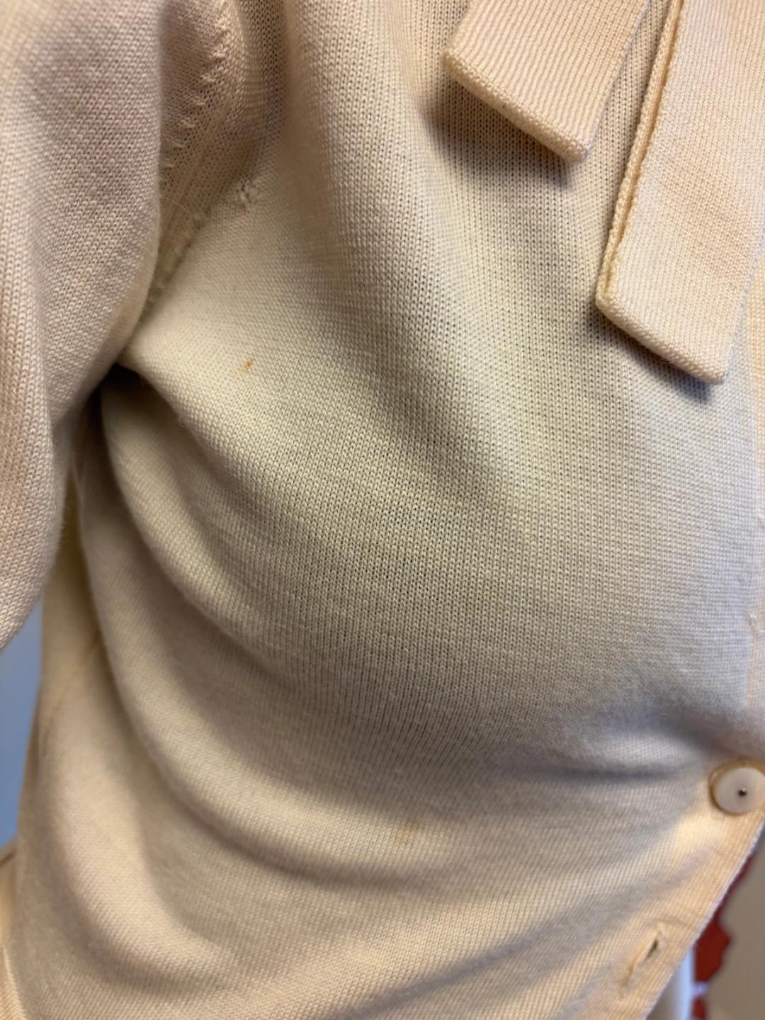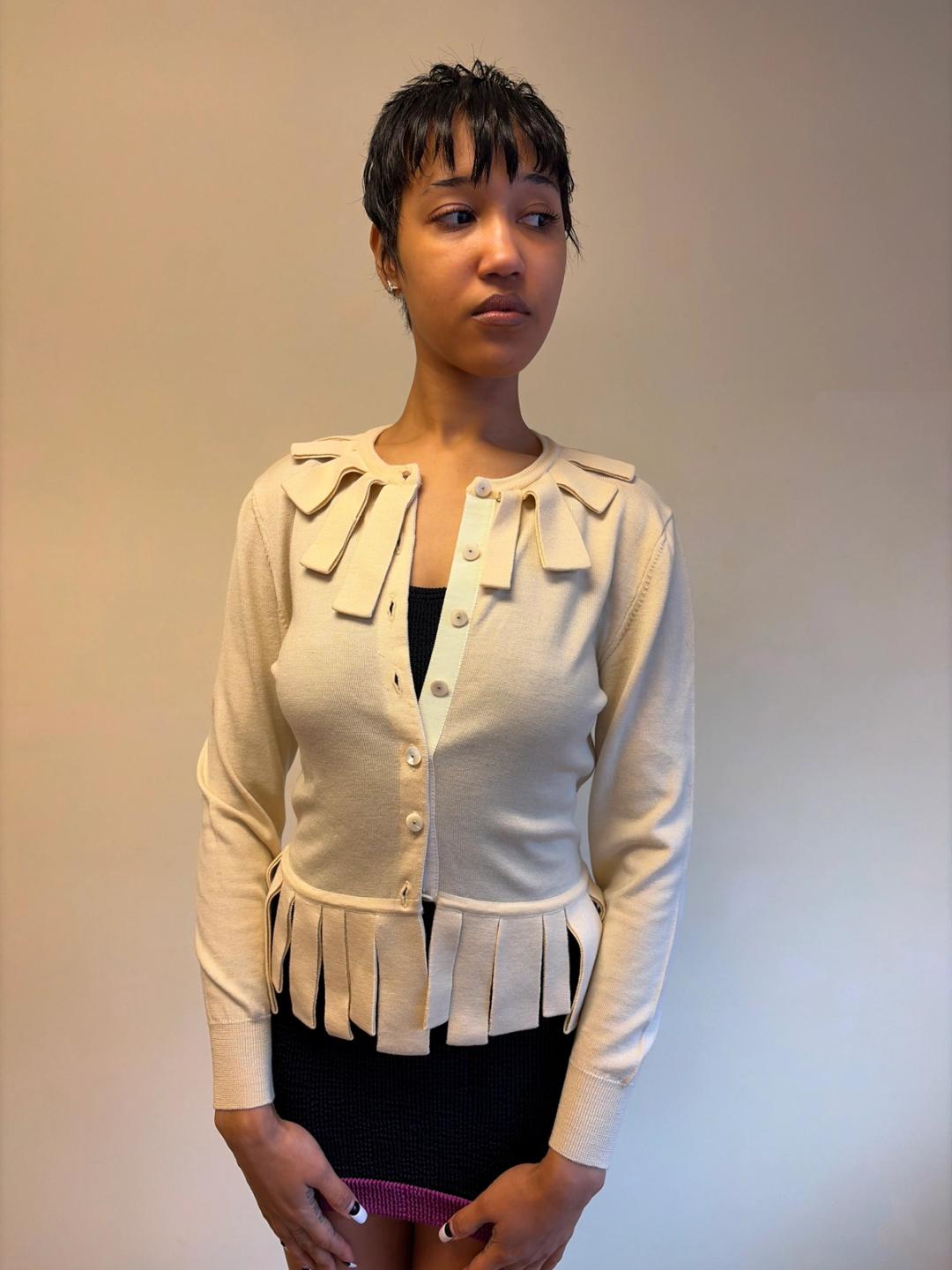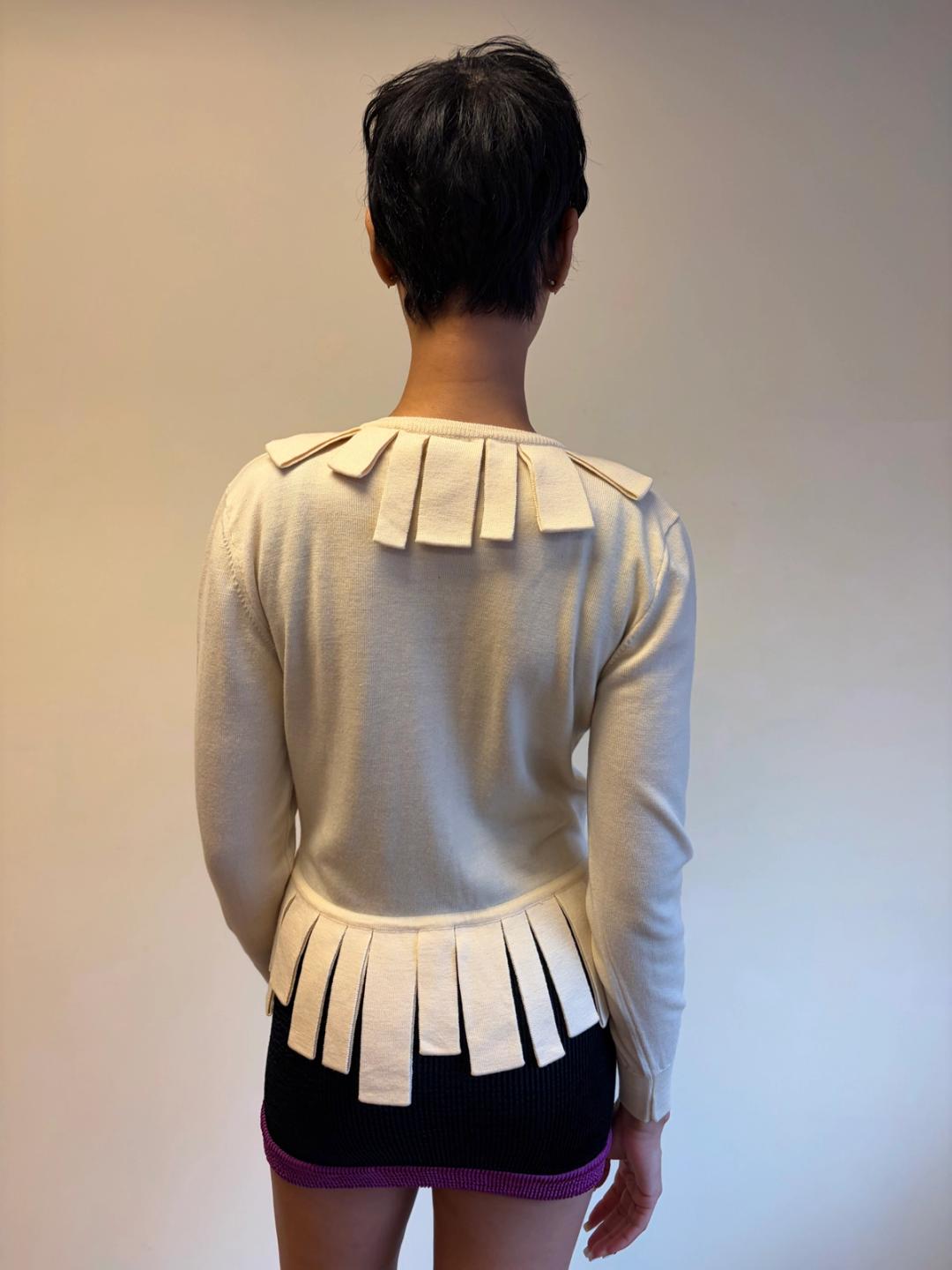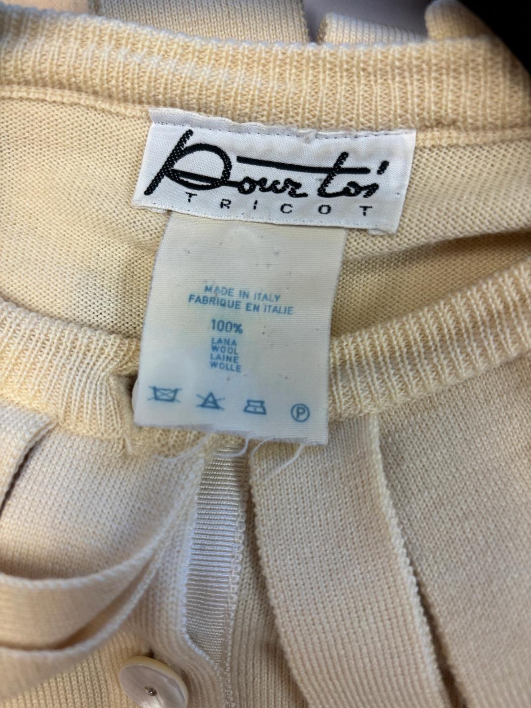 Lovely ivory cardigan by 1980s Italian label Pour Toi. It has trim made of self knit folded ribbons framing the neckline and waist, as well as MOP buttons. The label was made by a collaboration of three artists including Deanna Feretti of the eponymous Miss Deanna knitwear studio, famous for producing Margiela's early knitwear. The top has some scattered flaws, which is reflected in the price. Please see photos.