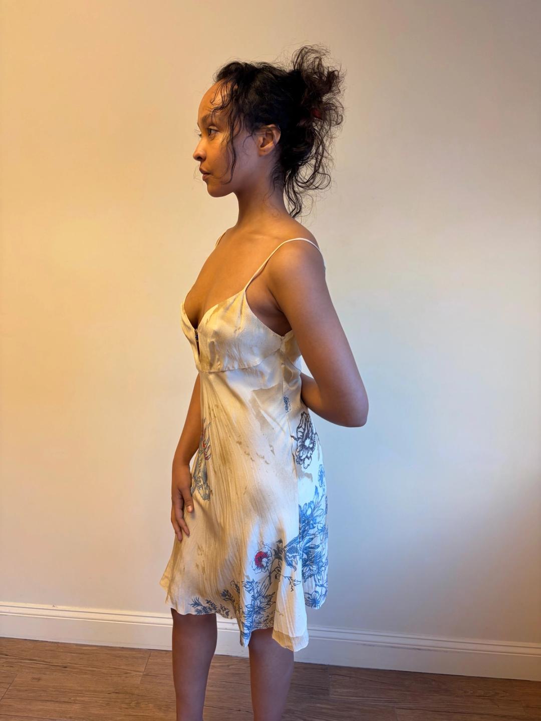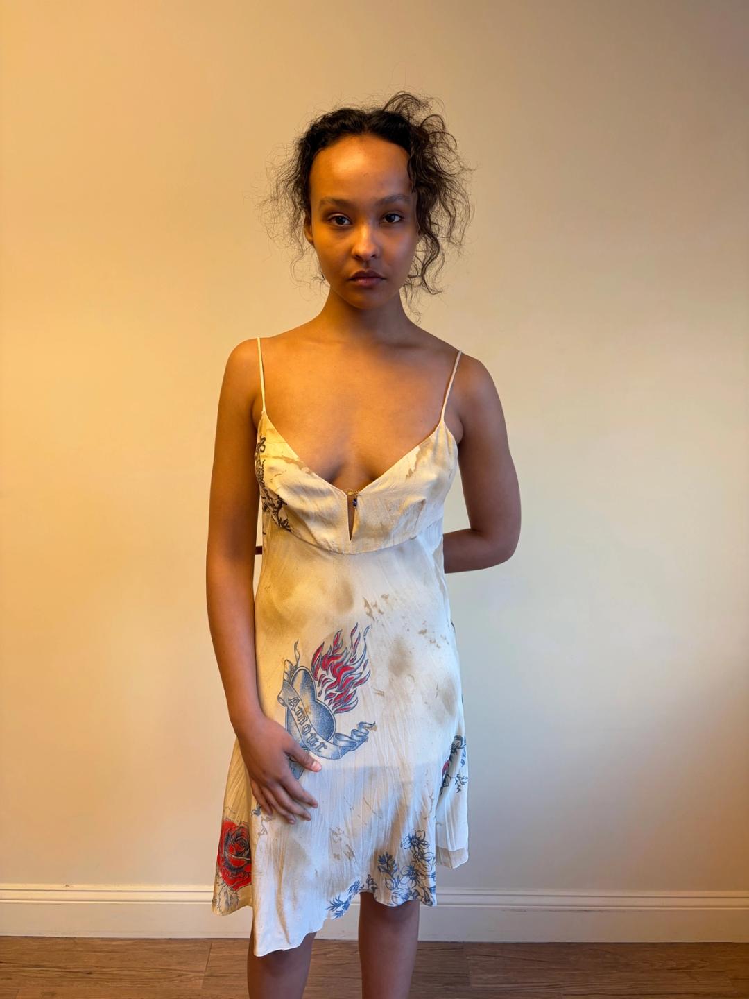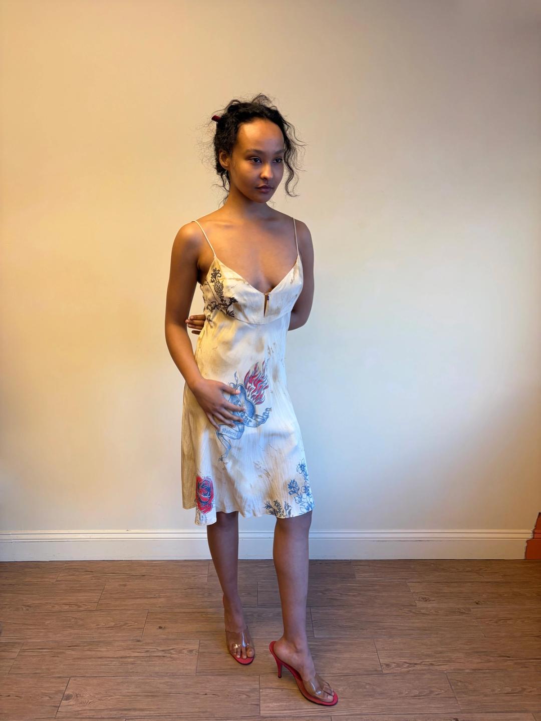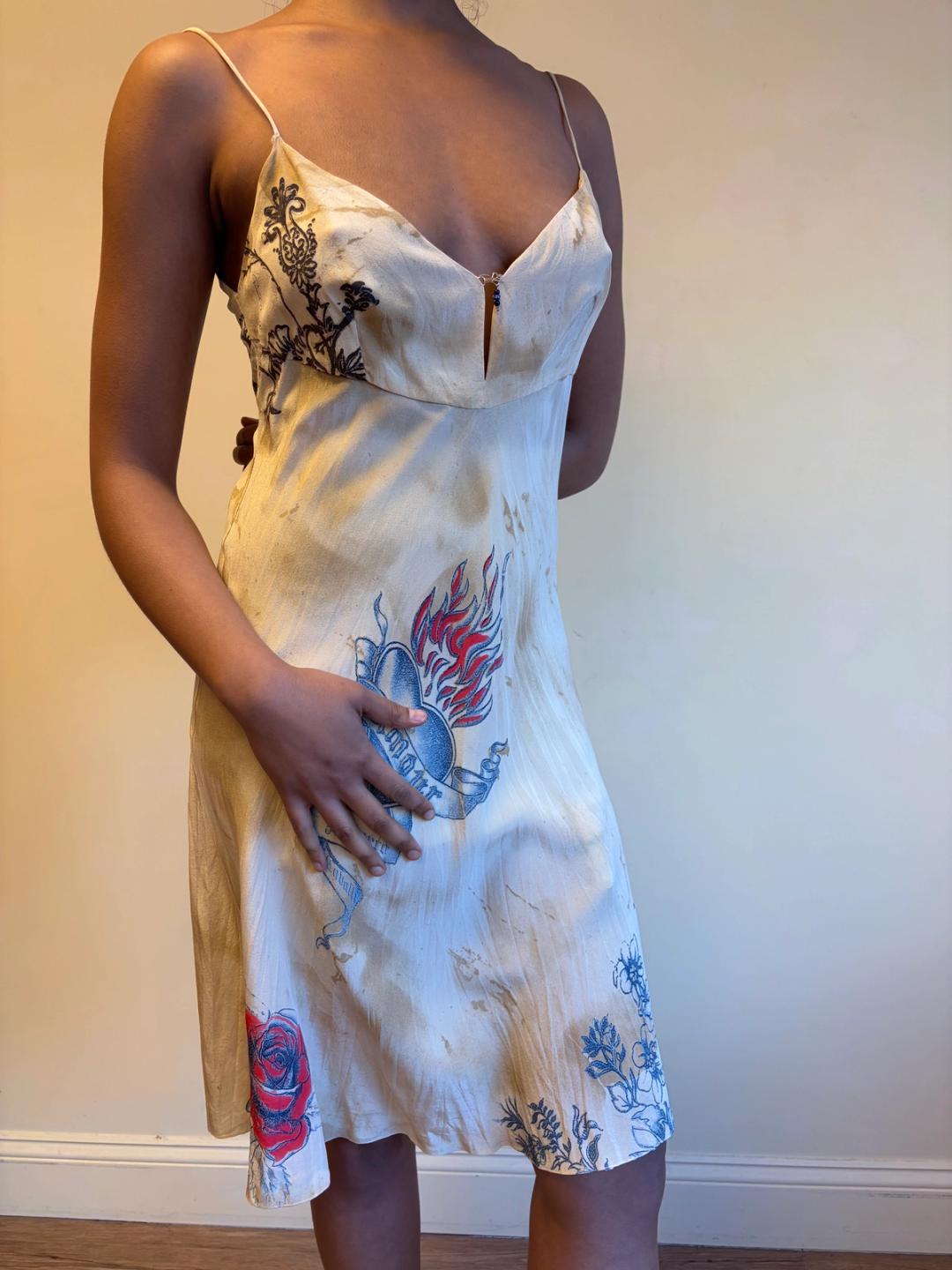 Vintage Roberto Cavalli trompe l'oeil "aged" and "stained" tattoo print bias cut slip dress. The dress has a delicate bead design on the bust.