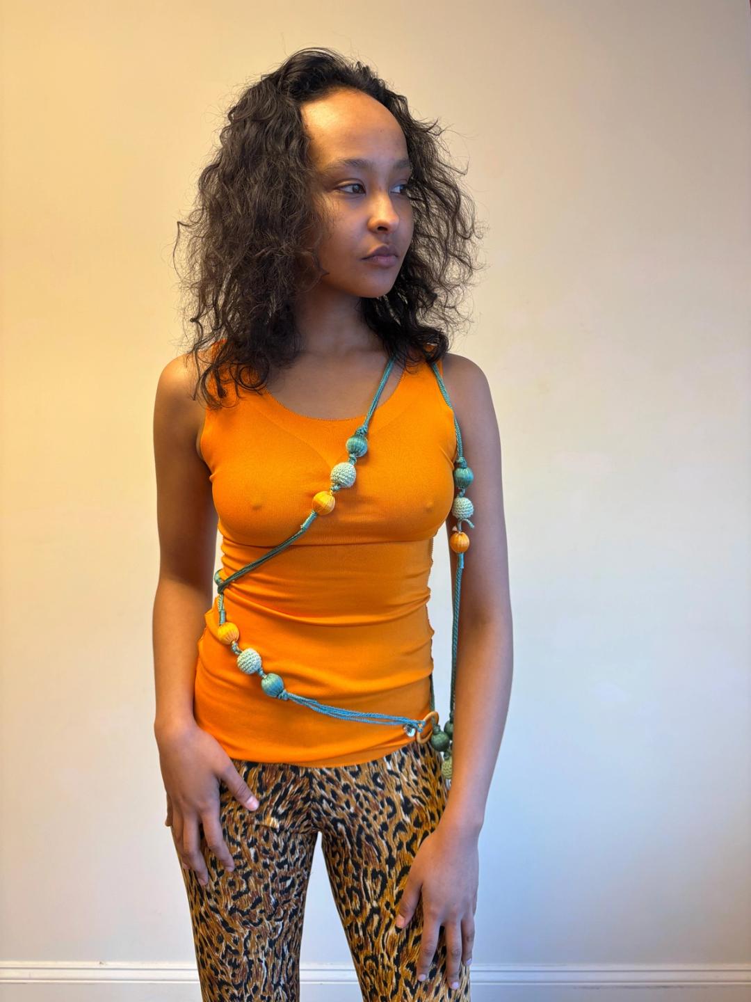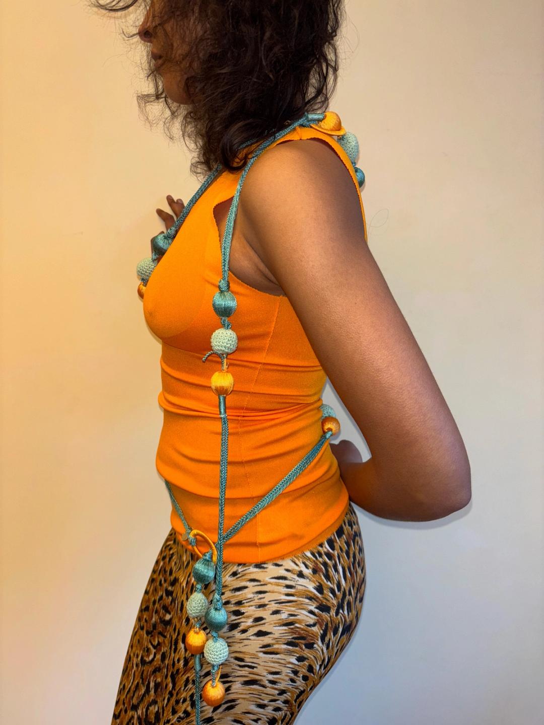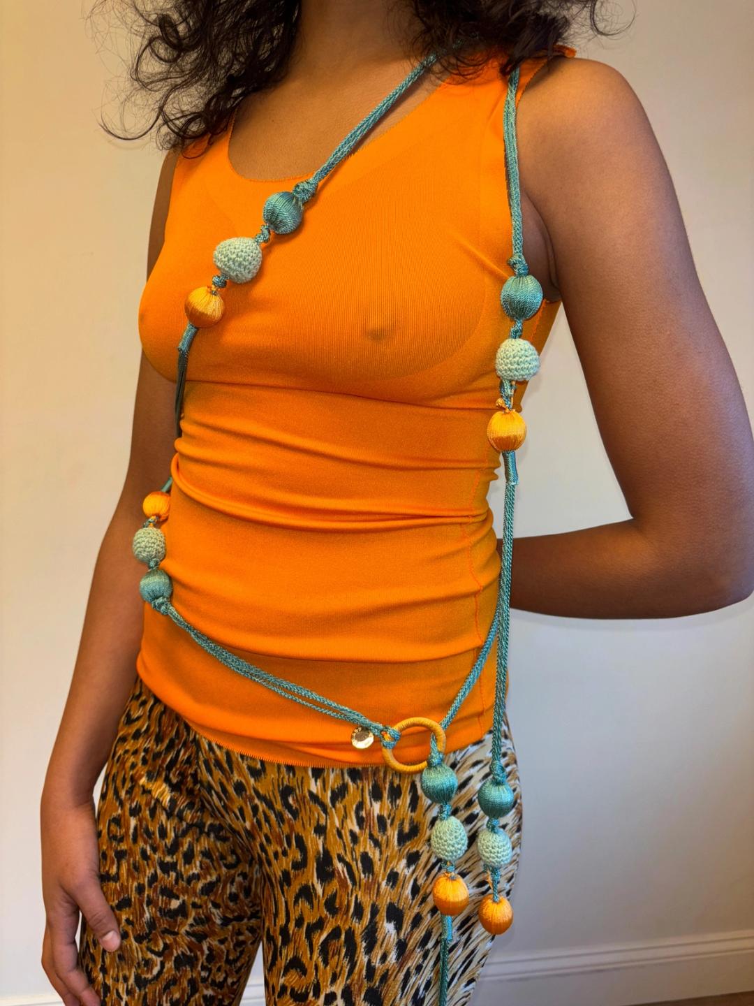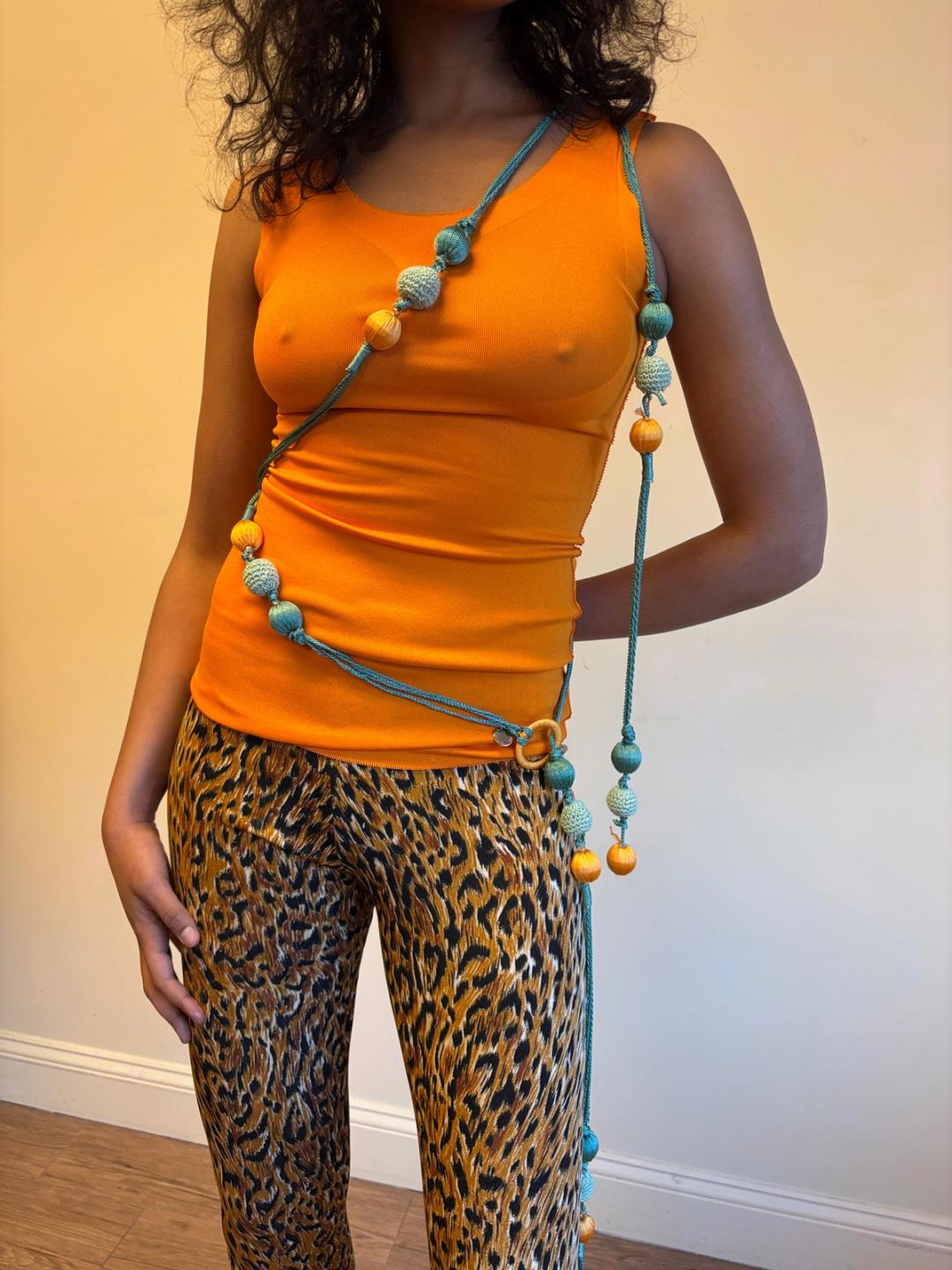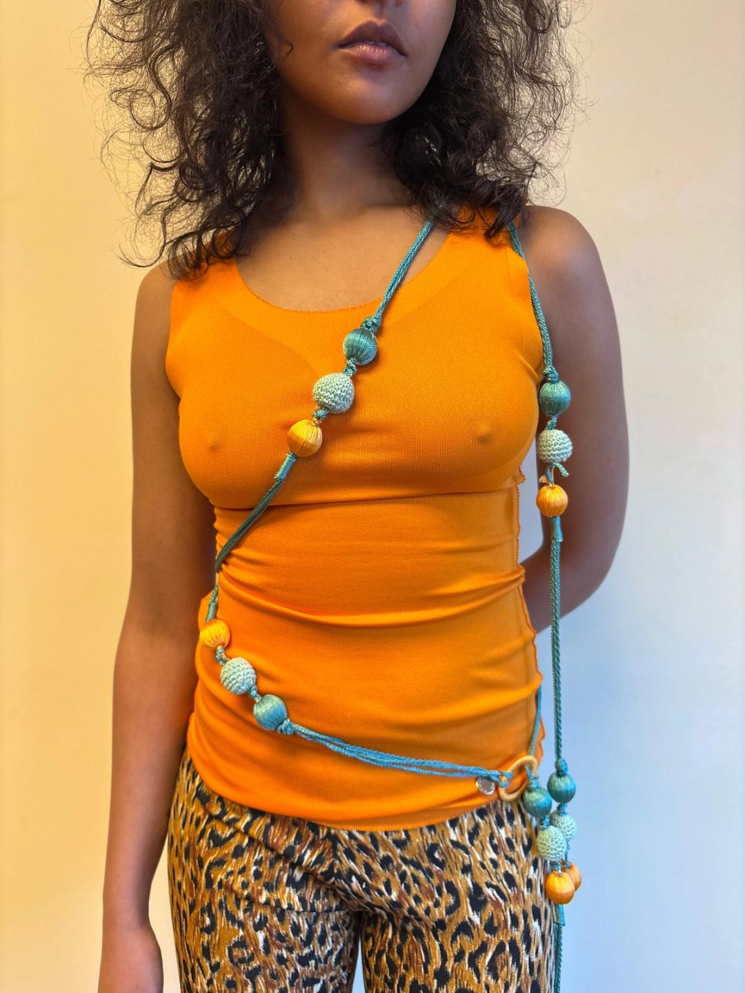 Unusual Roberto Cavalli double strand bauble belt. The belt can be worn in a variety of ways: as shown with one part around the waist and another draped on the body, as a double wrap belt or a single wrap belt. One size fits most.