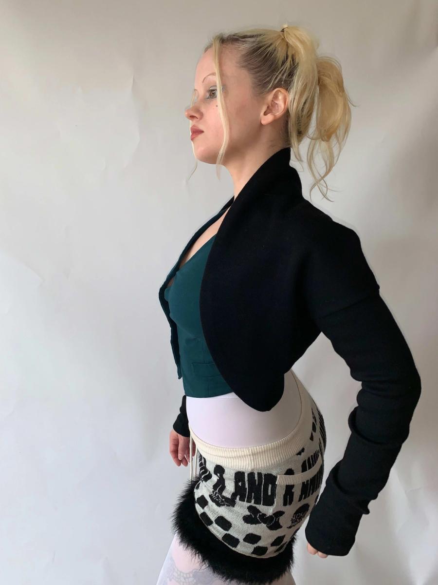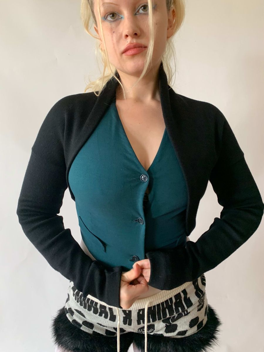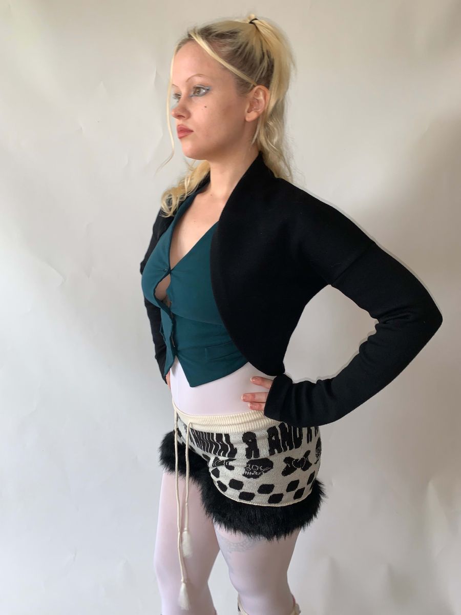Vintage Romeo Gigli black wool ballerina style shrug. Thick and sumptuous stretch wool, fitted extra long and scrunching sleeves. Beautiful, wearable item in pristine condition from a master of cut! Size is not marked but it is very stretchy and not size specific, could fit many sizes.