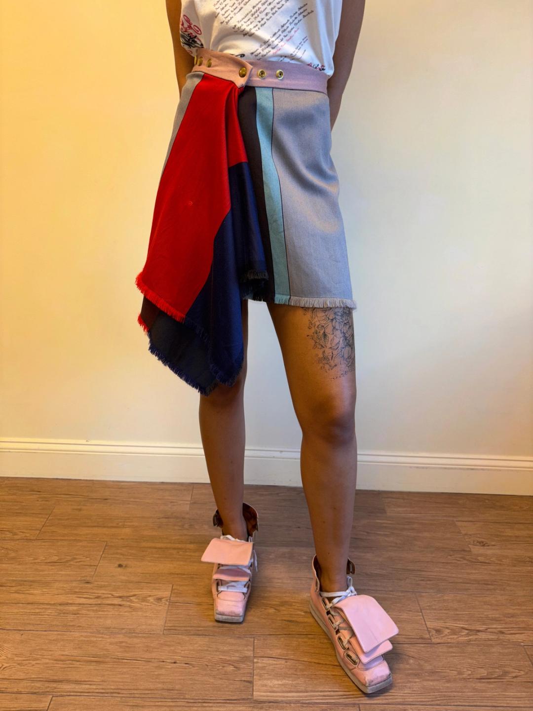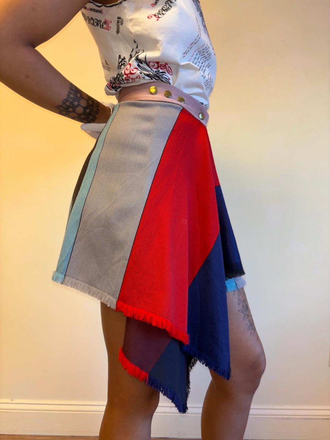 Vintage Sexy Dynamite blanket skirt. Seemingly an homage to a Westwood style. The skirt has snap closures and an irregular hem. It has a small spot on the front.