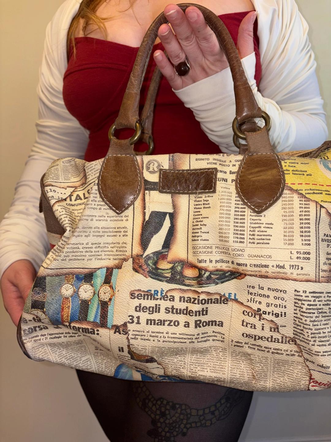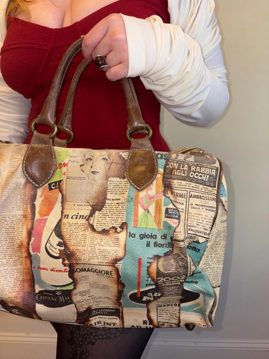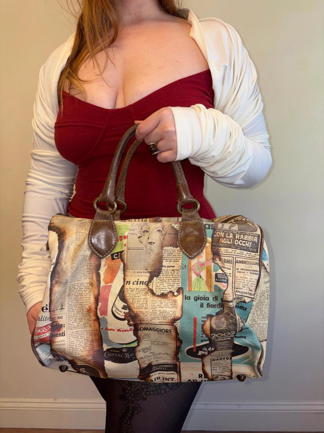 Italian newsprint bag with singed tromp l'oeil effect by Italian brand. Roomy with a pebbled texture and leather details.