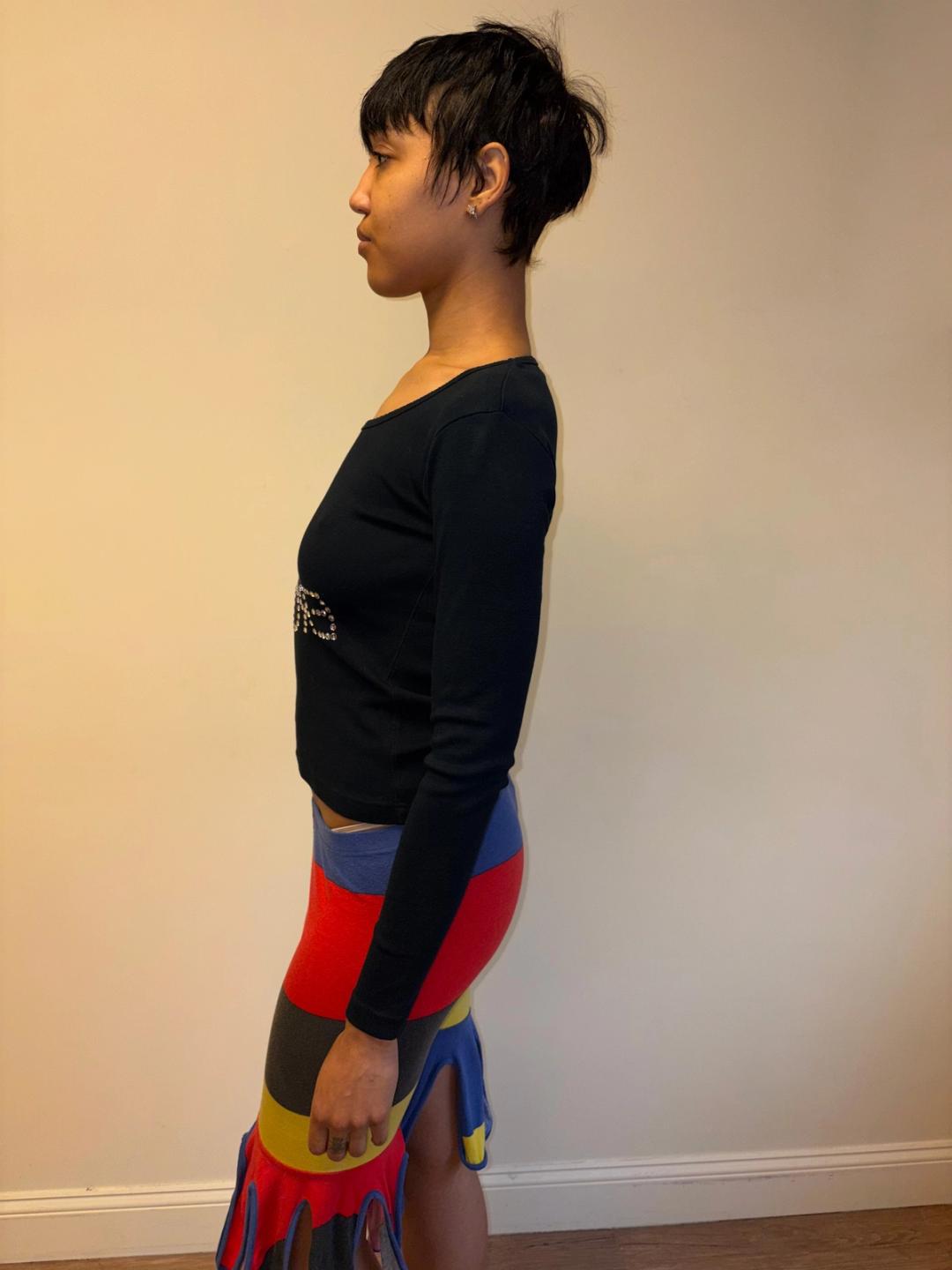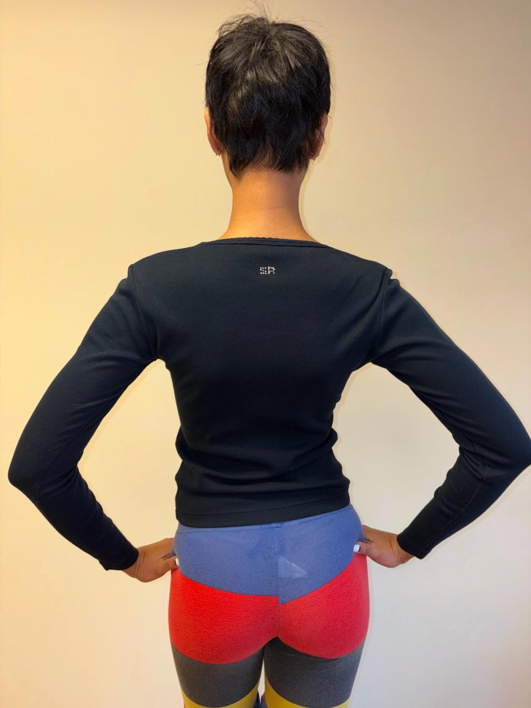 Vintage Sonia Rykiel long sleeve shirt with rhinestone text spelling out "EROTIC." 100% cotton. Marked a size S.