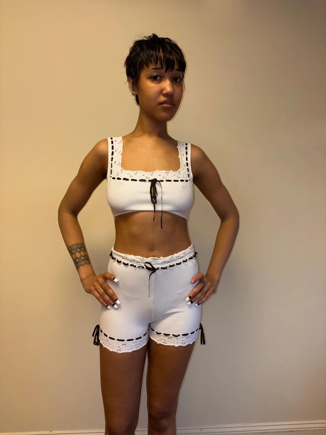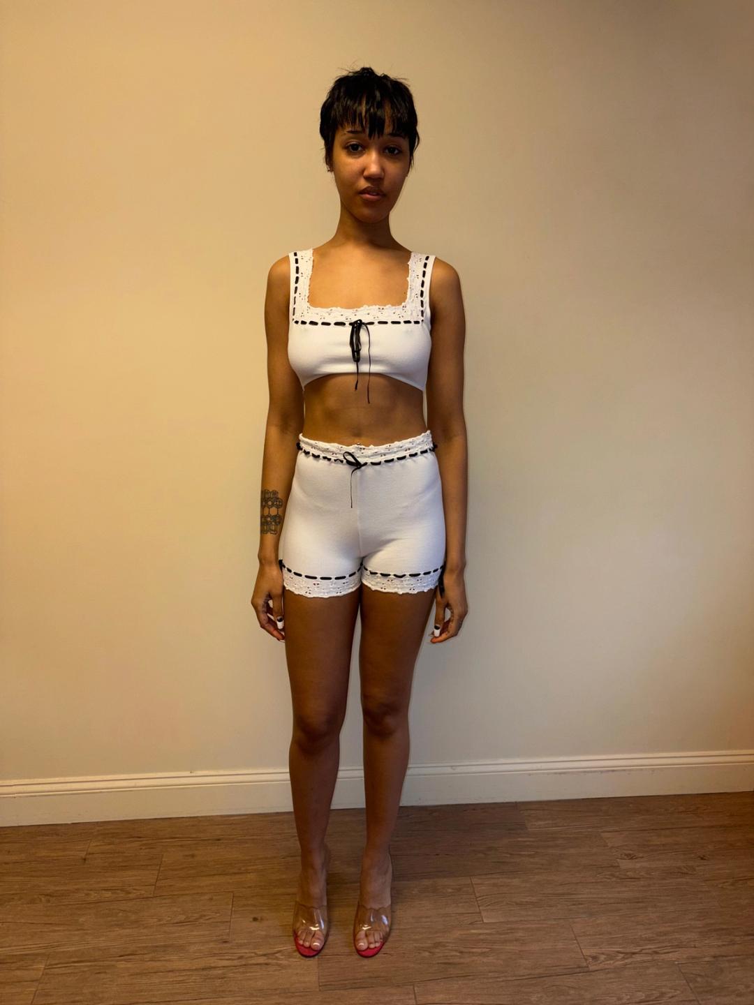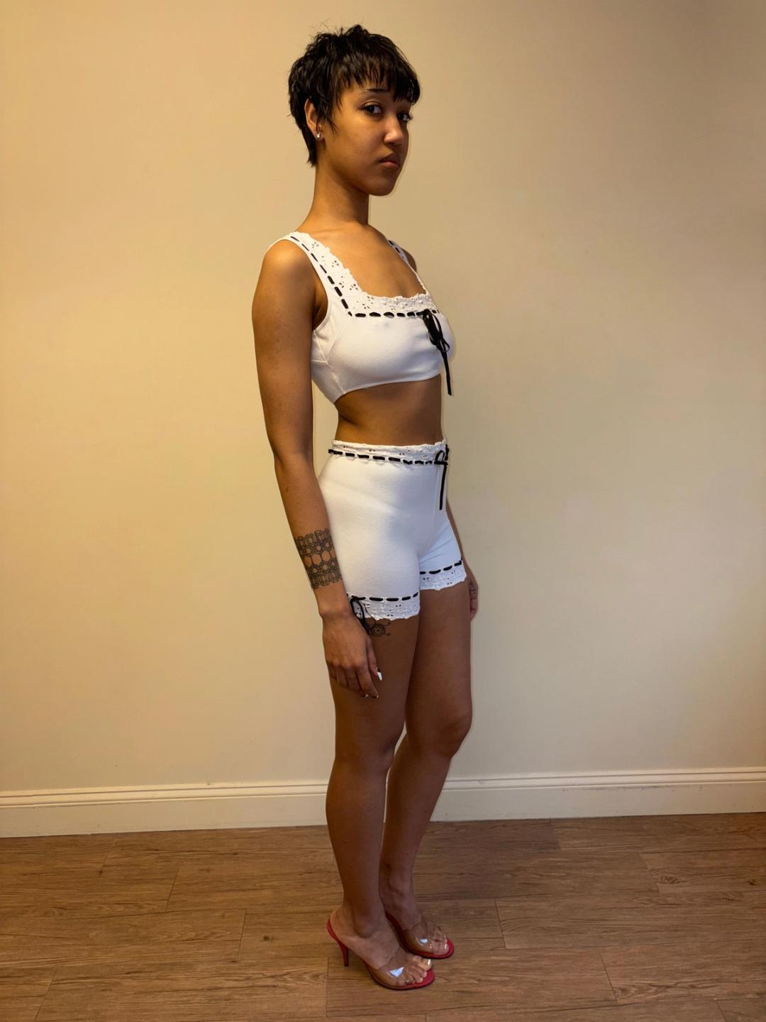 Stunning Spring/Summer 1992 Chantal Thomass white cotton eyelet ensemble with black ribbon. The set is comfortable and quite stretchy. In excellent vintage condition!