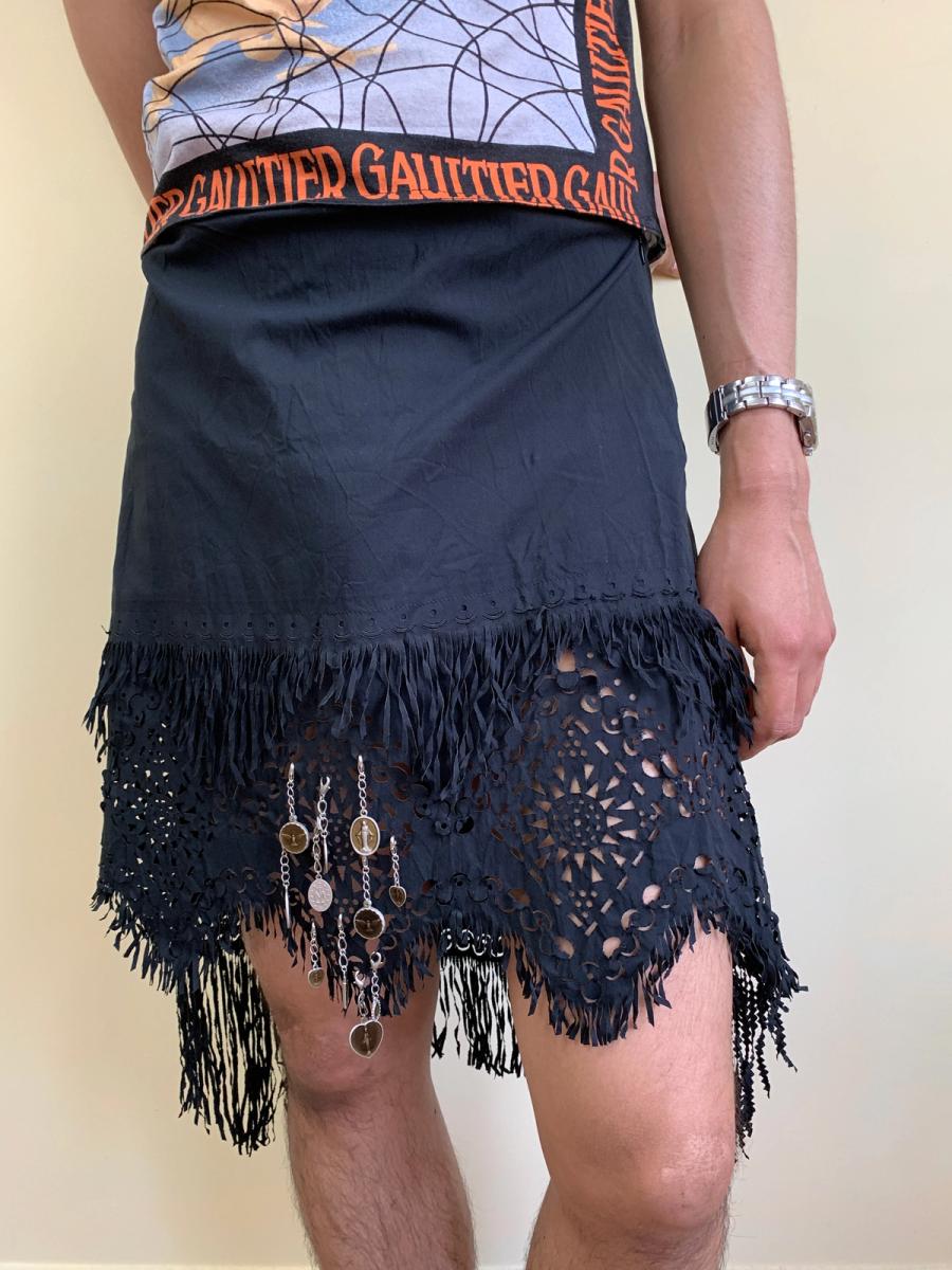Rare skirt by Jean-Paul Gaultier from the SS 2003 runway. It's made of laser cut stretch cotton with rosary charms which can be detached and arranged as you please.