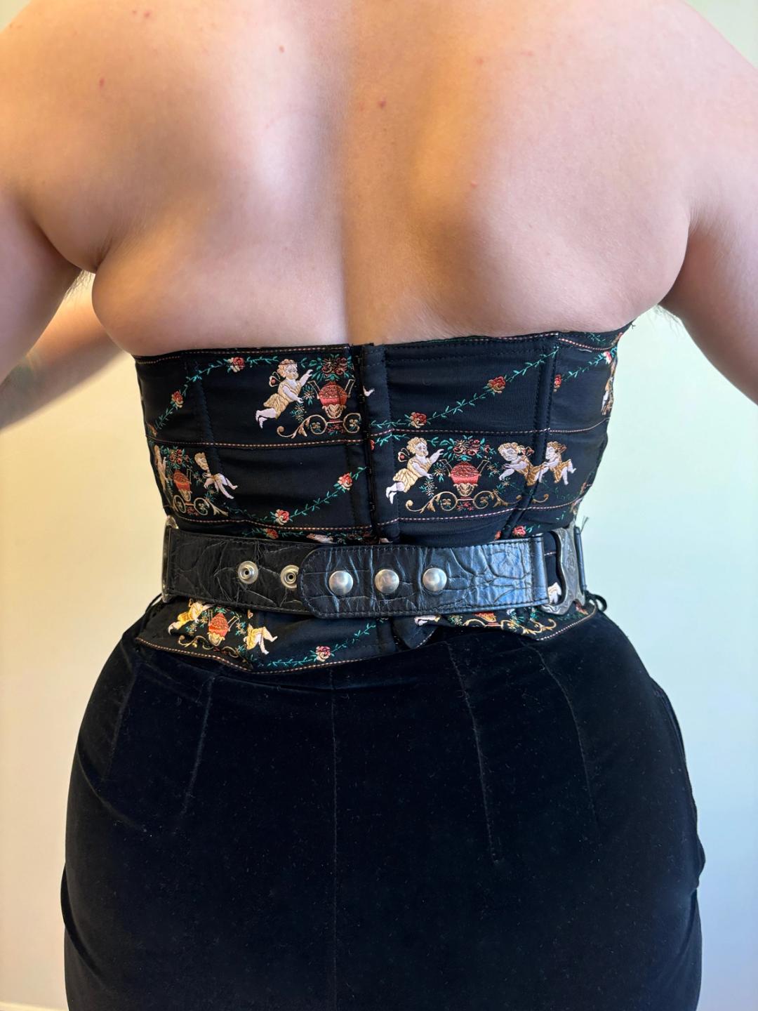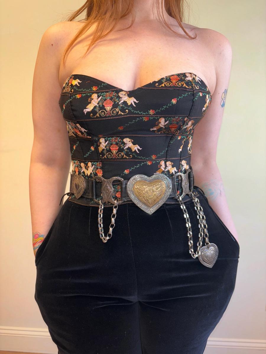 Rare vintage belt by Streets Ahead. The belt has a black leather strap and antique silver engraved hardware. It has oversized heart charms and dangling chains. Adjustable. Fits between a 24.5"-27" waist.