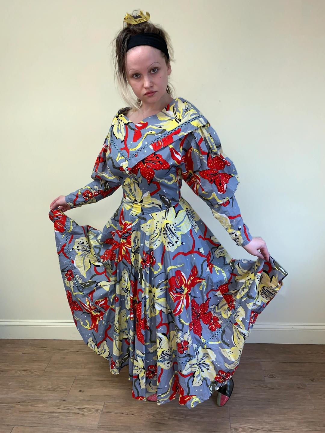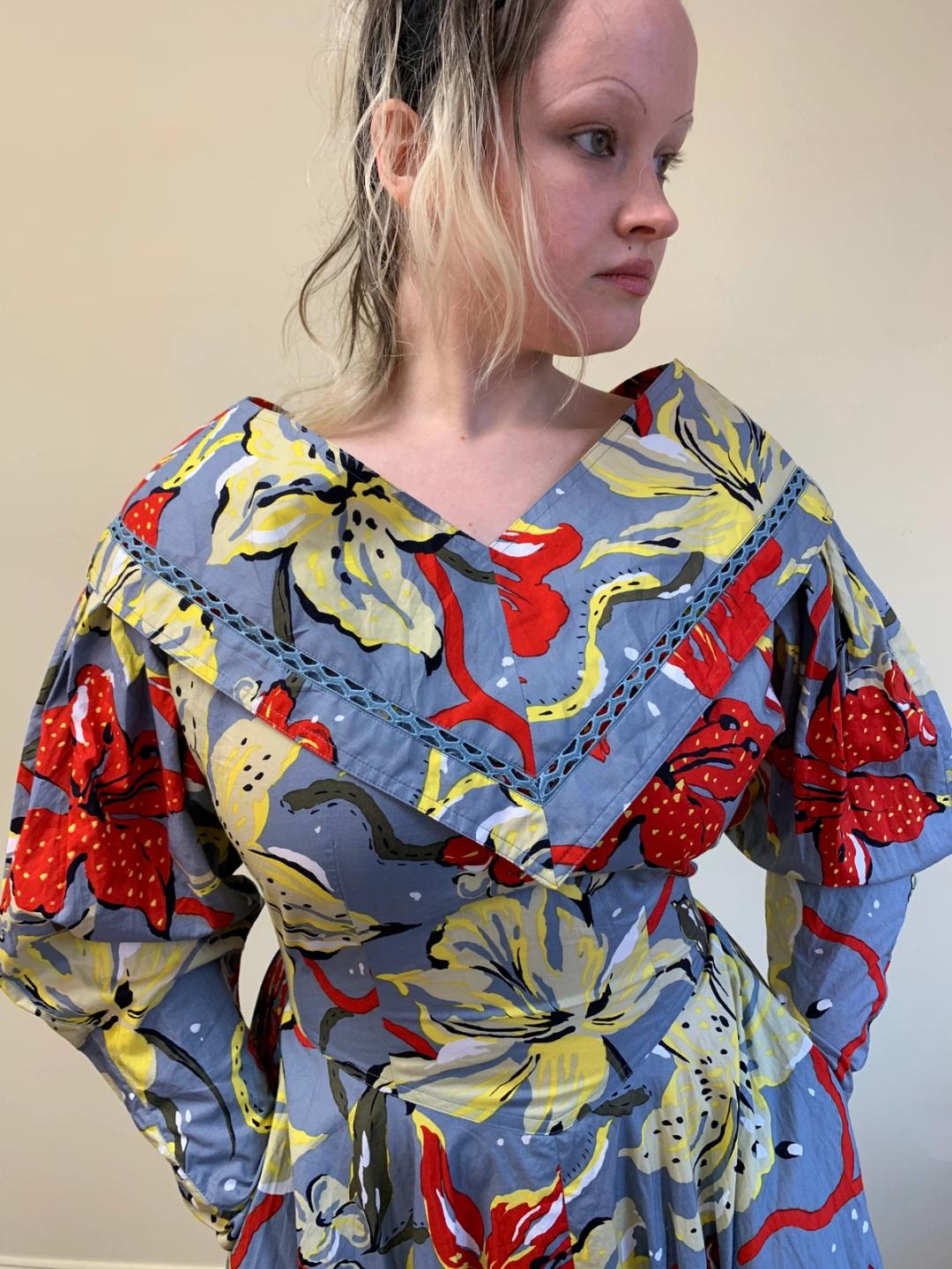 1980s cotton summer dress by Japanese label Takezo by Takezo Toyoguchi. The dress has a bold oversized print of tiger lilies, mutton sleeves, cinched waist, and a sweeping circle skirt with pockets. Despite the dramatic silhouette the dress is so comfortable and easy to wear! It has a semi-detached collar which along with other elements makes it reminiscent of 1830s dress. In perfect condition.
