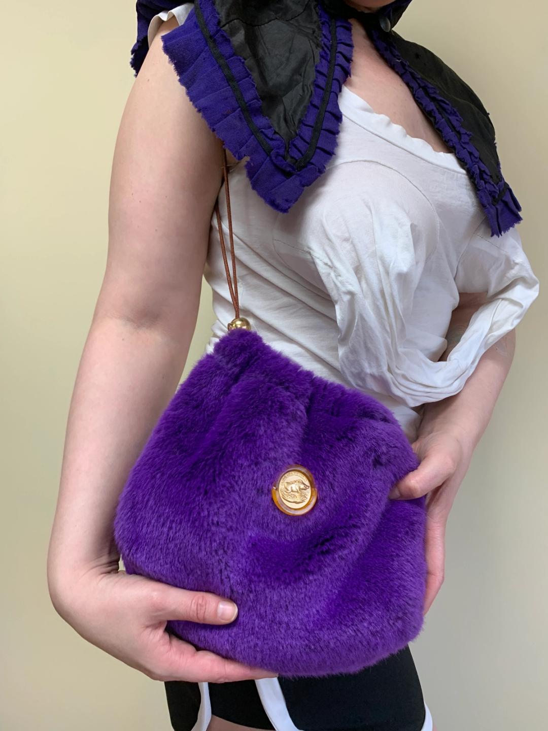 Purple faux fur reticule bag by Japanese brand Theatre Products. The bag has a toggle drawstring closure and a logo emblem depicting a hog! In pristine condition.