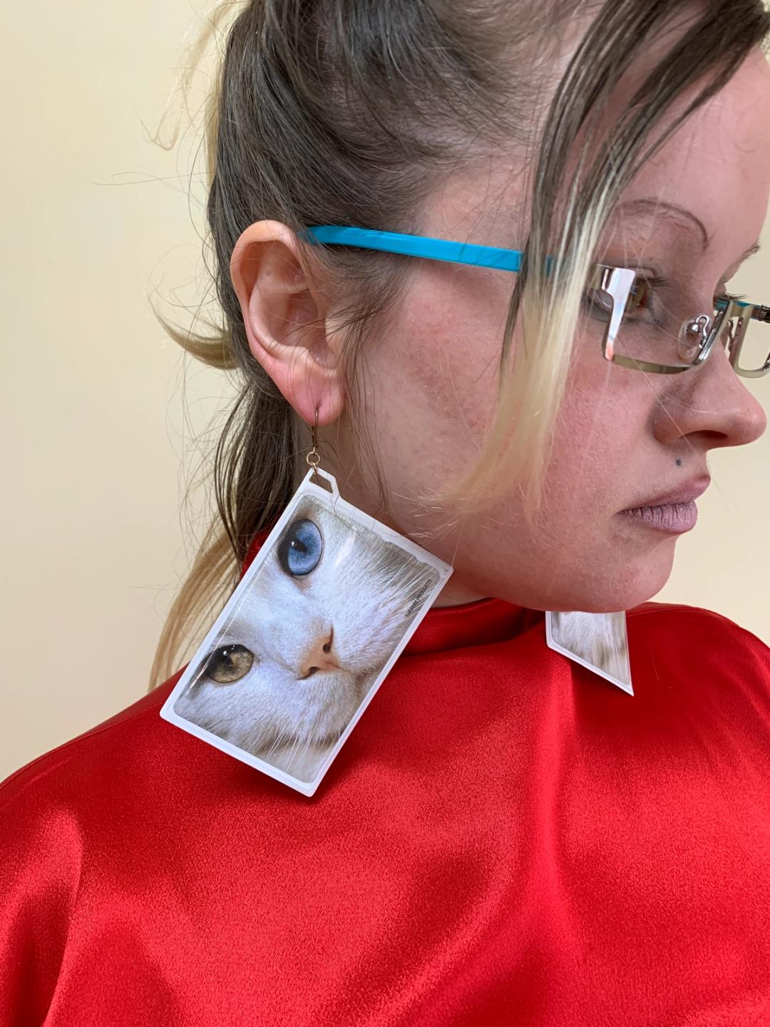 Theatre Products earrings with oversized plastic sealed cards featuring a cat with Heterochromia.