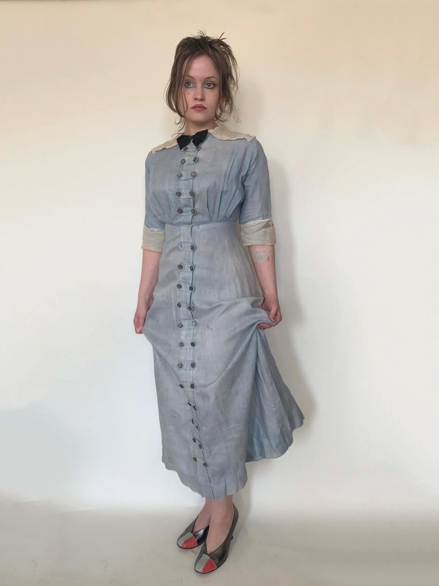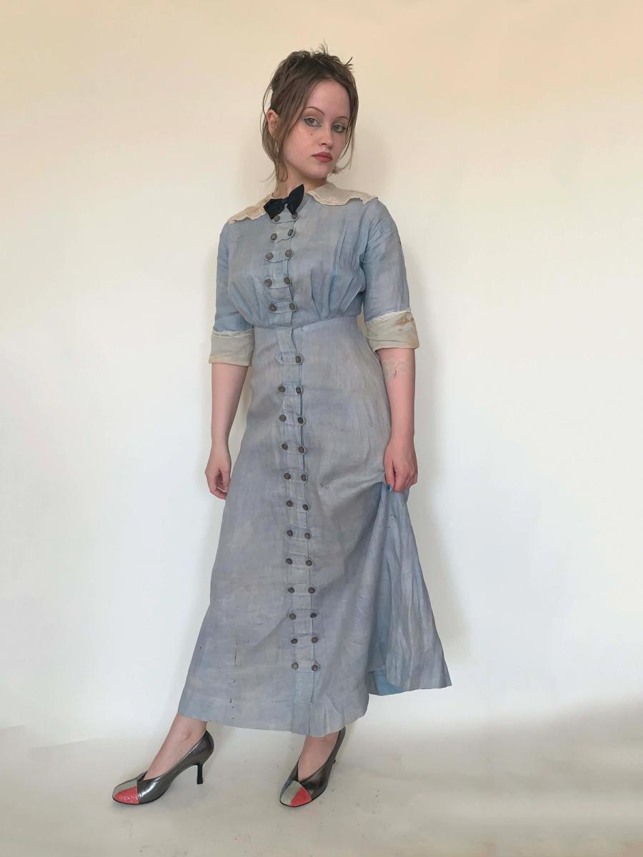 Smart and chic working woman dress in blue linen with organza collar and cuffs, dating from 1900 to the mid Teens. It has beautiful abalone buttons all down the front (missing only one) and detachable silk bow. The dress is faded and has some staining and discoloration, but it's in very sturdy and wearable condition. It's nice that it can still be worn, but you don't have to feel guilty about destroying a perfectly preserved artifact. It's rare to see stylized workwear like this from the period!