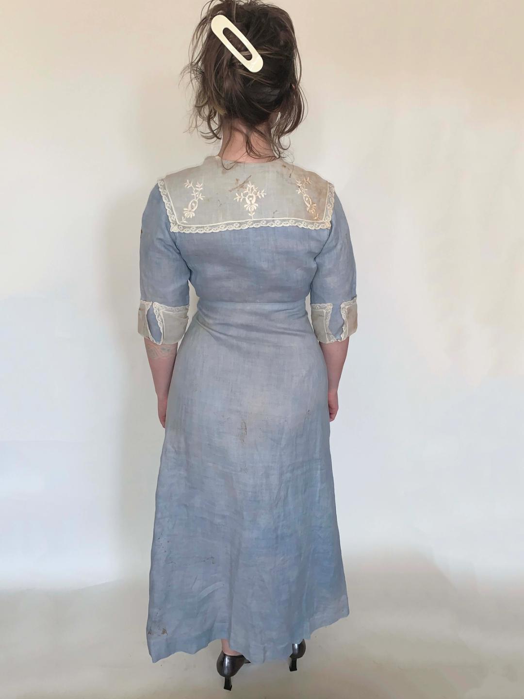 Smart and chic working woman dress in blue linen with organza collar and cuffs, dating from 1900 to the mid Teens. It has beautiful abalone buttons all down the front (missing only one) and detachable silk bow. The dress is faded and has some staining and discoloration, but it's in very sturdy and wearable condition. It's nice that it can still be worn, but you don't have to feel guilty about destroying a perfectly preserved artifact. It's rare to see stylized workwear like this from the period!