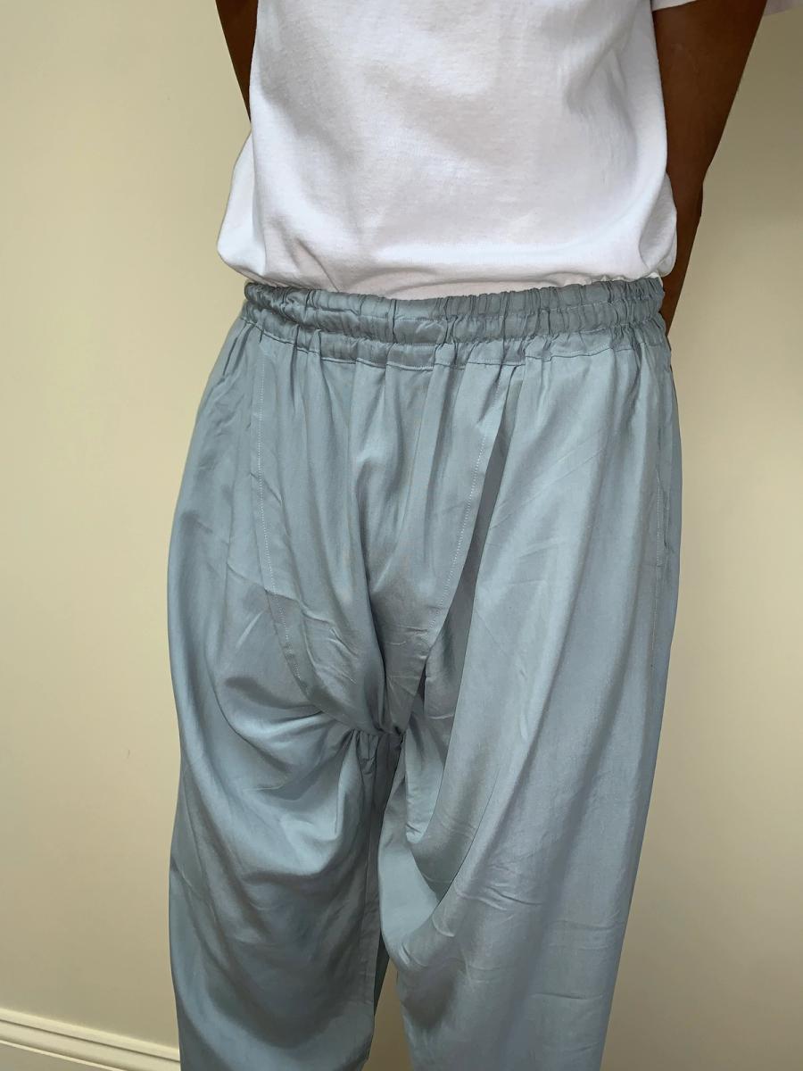 Silk trousers by Tokio Kumagai with an unusual loincloth detail. The wraparound "loincloth" feature causes the pant to be gathered and drape in an elegant way. They have an elastic waist with an interior drawstring, as well as utilitarian pockets. In fabulous, seemingly pristine condition. A rare designer.