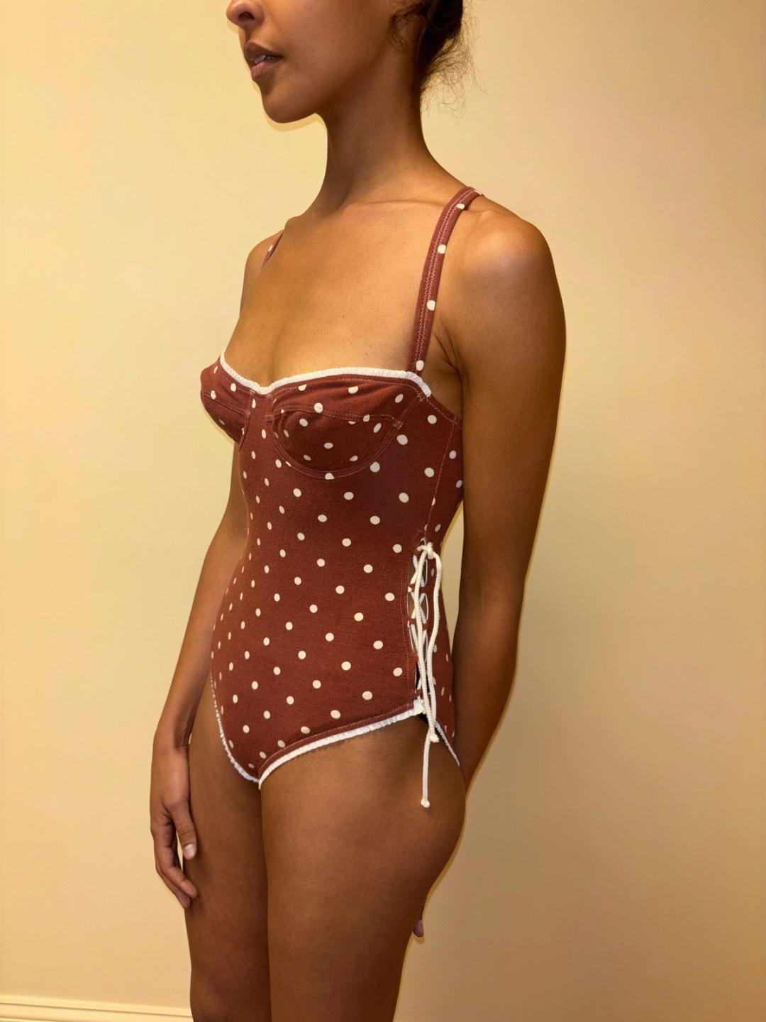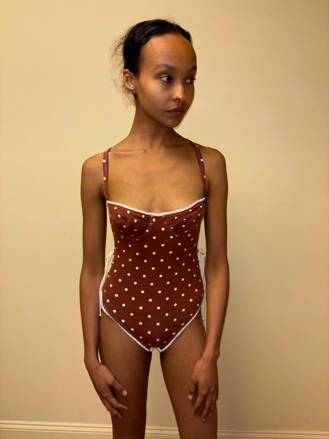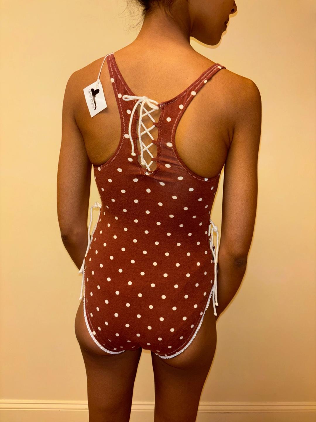 90s Chantal Thomass cotton leotard or swimsuit with a polka dot print. There is a lace up design on the back and sides. The leotard is new with tags.