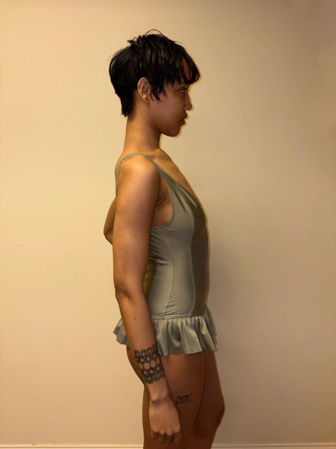 Vintage Chantal Thomass sage colored one-piece swimsuit. The swimsuit has a micro mini skirt. Stretchy.